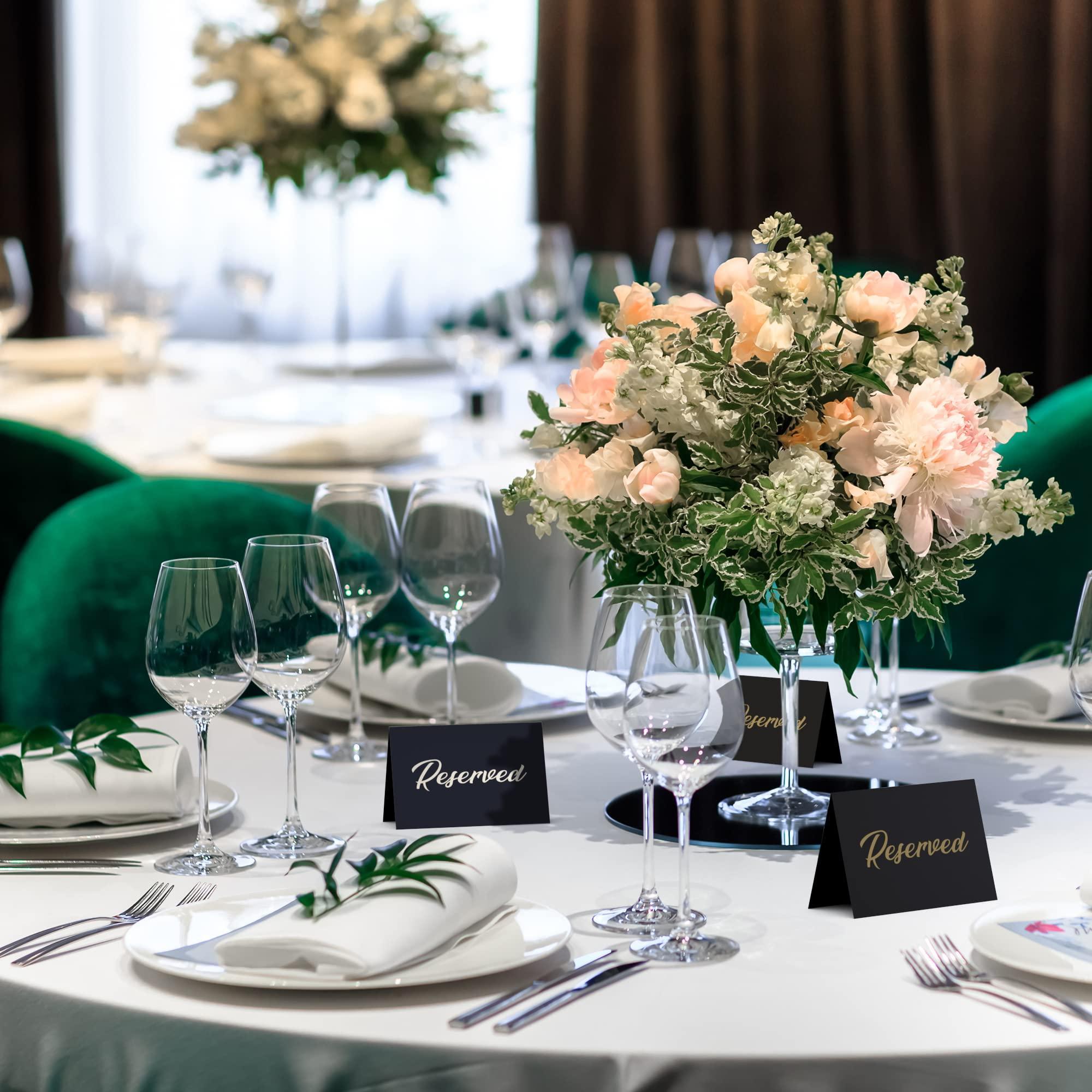 10 Pack Black Reserved Table Signs with gold foil letters. Size: Height 3.93 x 5.9 Length Inch (double sided 15x10cm), Material: Cardstock, Colour: Black with gold foil