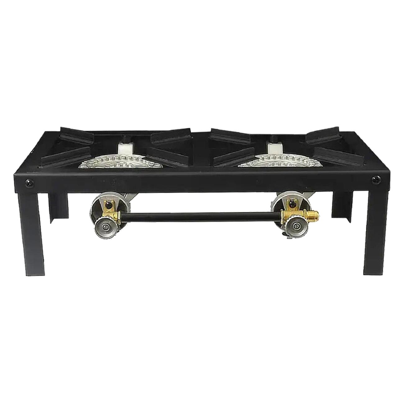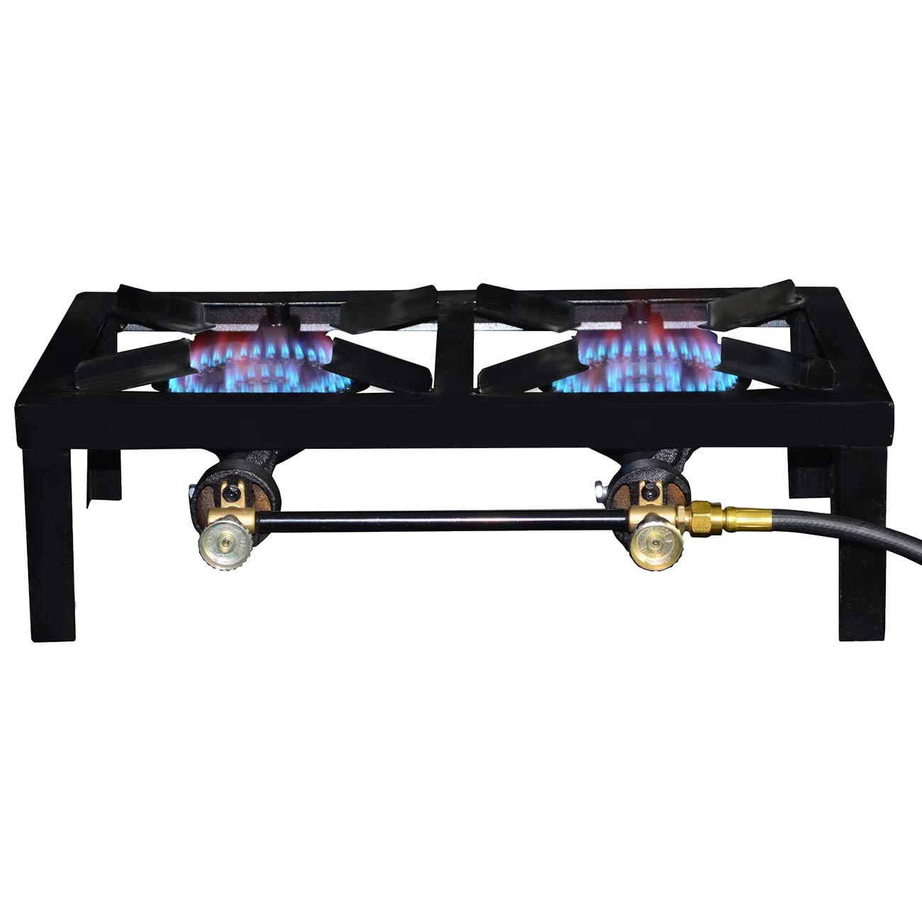 This heavy duty Double Burner Angle Iron Stove is more durable than its cast iron counterparts and delivers an impressive 15,000 -30,000 BTUs of power. The adjustable legs allow you to maintain a level cooking surface when outside and the range style cook top delivers a fine tuned combustion, allowing your fuel to burn cleaner and hotter. Regulator and hose must be purchased separately.