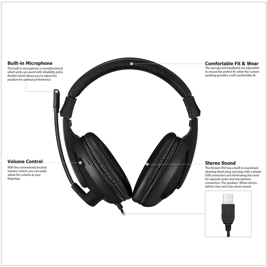 The Xtream™ H5U Multimedia Headphones with Microphone are stylishly designed for active lifestyles. The built-in soundcard allows for direct plug-and-play with a simple USB connection, eliminating the need for separate audio and microphone connection.
