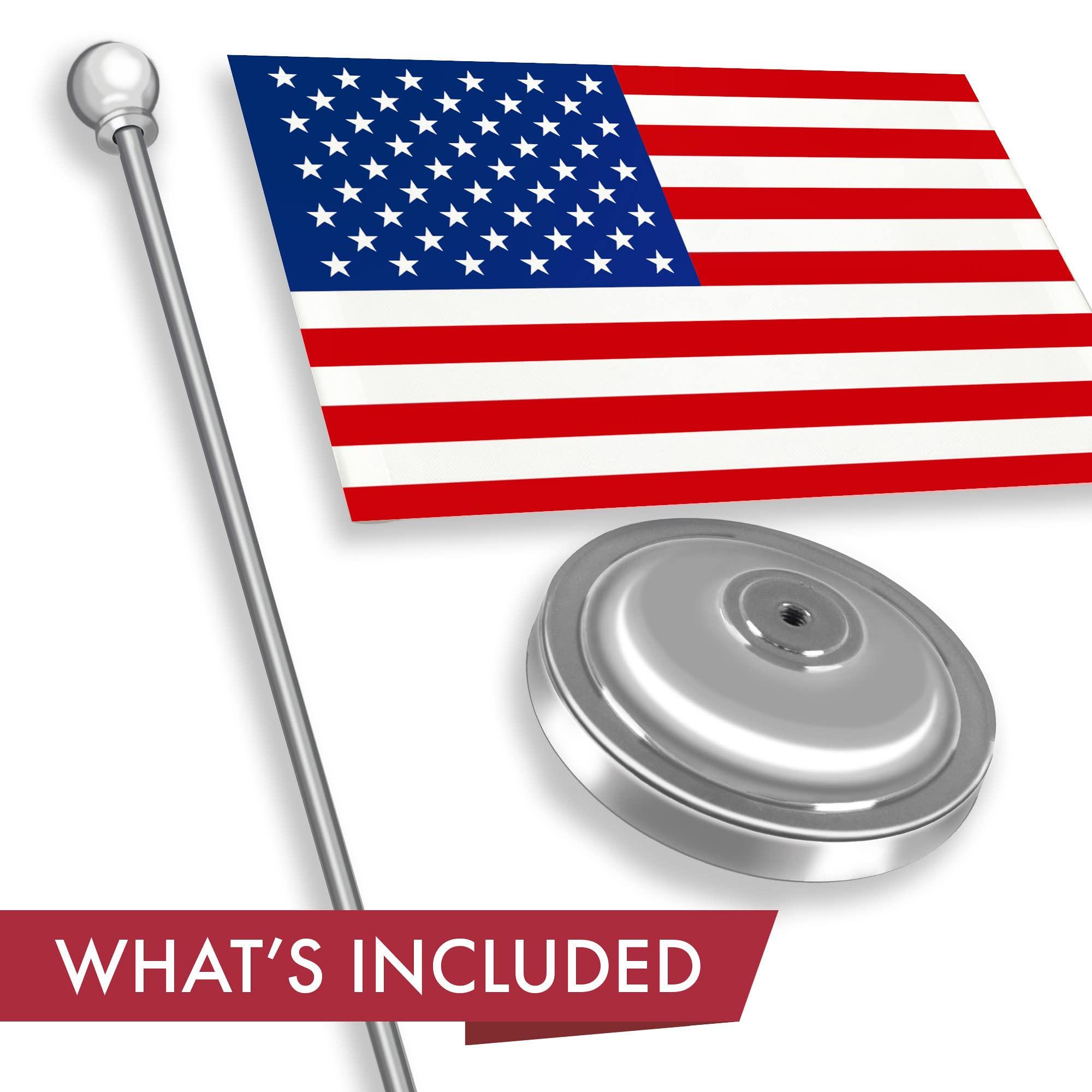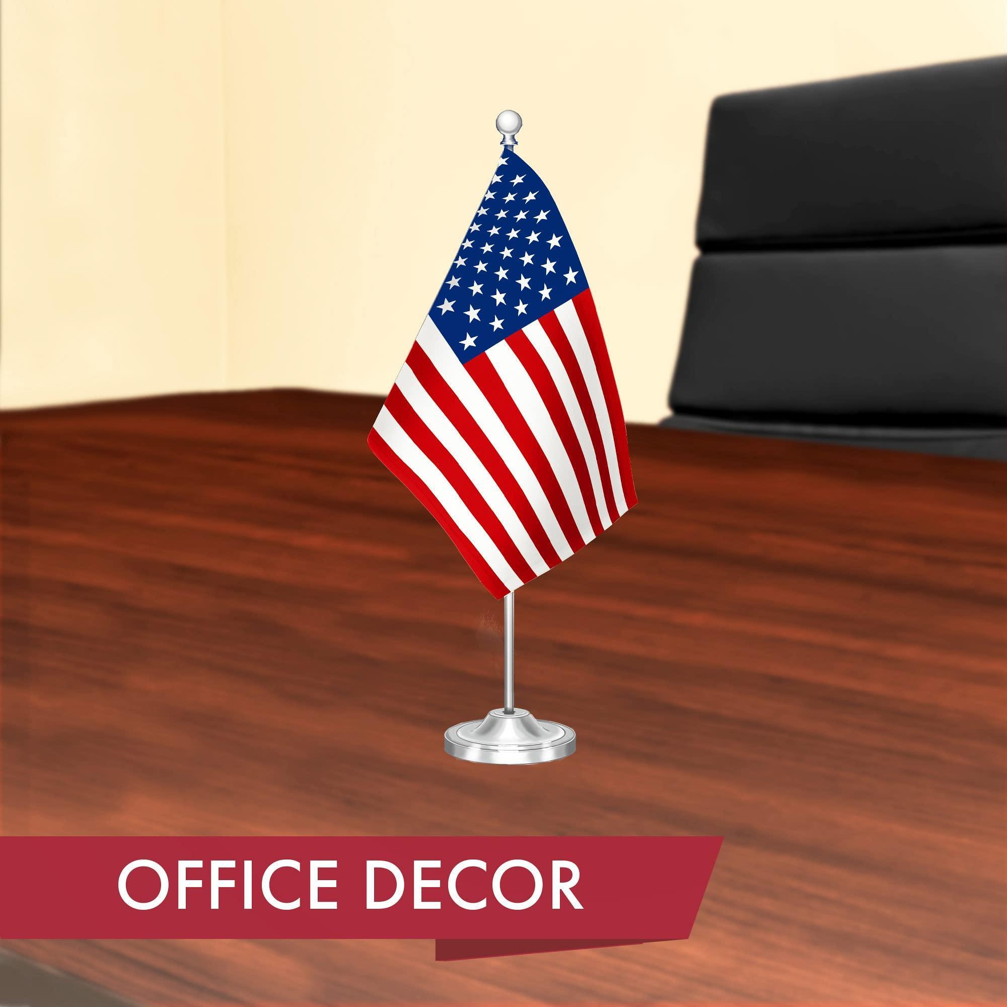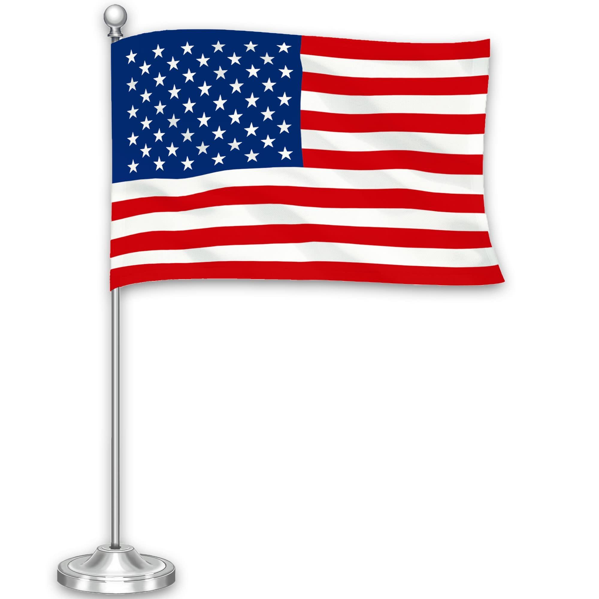 Flag is made of durable 300D polyester with silver metal stick and suede non-slip stand base