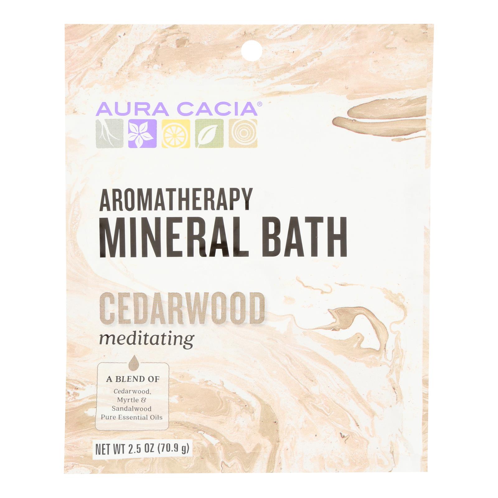 AURA CACIA MEDITATING CEDARWOOD AROMATHERAPY MINERAL BATH IS A BLEND OF MINERALS THAT LET YOU EMERGE FROM THE SOOTHING WATERS OF YOUR TUB FEELING REFRESHED AND VELVETY SMOOTH. MADE FROM 100% PURE ESSENTIAL OILS, THIS MINERAL BATH LETS YOU CREATE AN AT-HOME SPA TREATMENT THAT STABILIZES THE SENSES, TONES THE BODY AND ANCHORS THE SPIRIT. THIS MINERAL BATH CONTAINS THREE MAIN SCENTS: CEDARWOOD FOR STRENGTHENING AND RELAXING, MYRTLE FOR ELEVATING AND HARMONIZING AND SANDALWOOD FOR FOCUSING AND CENTERING. THIS MINERAL BATH IS NOT TESTED ON ANIMALS, IS SAFE FOR SPAS AND WHIRLPOOLS AND DOES NOT CONTAIN SYNTHETIC INGREDIENTS, PETROLEUM OR PARABENS. EACH PACKET OF AURA CACIA MEDITATING CEDARWOOD AROMATHERAPY MINERAL BATH CONTAINS 2.5 OZ. OF PRODUCT. SEE LABEL FOR WARNINGS.