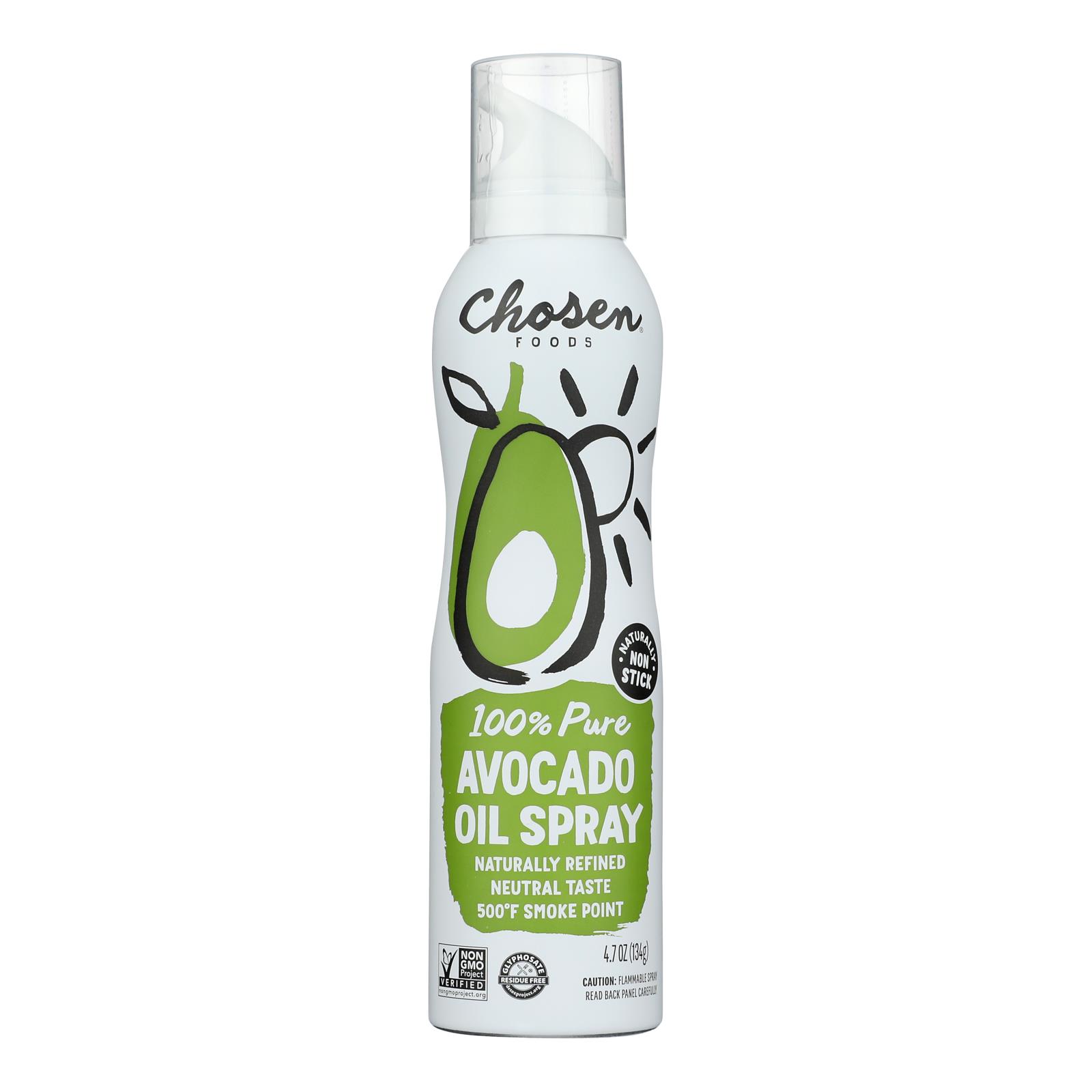 CHOSEN FOODS AVOCADO OIL SPRAY IS 100% PURE AVOCADO OIL, WHICH MEANS THAT THE ONLY INGREDIENT YOU’LL FIND IN THIS COOKING SPRAY IS AVOCADO OIL. USE FOR AN EASY SALAD SPRITZ, TOSSING VEGETABLES, COATING PASTAS, BROILING, BARBECUING, SEARING AND MORE. THERE ARE NO CHEMICALS, PROPELLANTS AND EMULSIFIERS IN OUR SPRAY WHICH MEANS IT STAYS PURE AND HEALTHY. MADE FROM 100% PURE AVOCADOS IT IS FIRST COLD PRESSED, THEN NATURALLY REFINED BY REMOVING THE CHLOROPHYLL, WAXES AND SEDIMENTS. THIS NATURALLY REFINED SPRAY USES SAGE AIR-PRESSURE TECHNOLOGY TO REPLACE THE NEED FOR ANY ADDITIVES OR CHEMICAL PROPELLANTS. SPRAY QUICKLY AND EVENLY ON YOUR RECIPES OR YOUR COOKWARE. INCLUDES 4.7 OZ. CHOSEN FOODS AVOCADO OIL SPRAY. THE MISSION OF CHOSEN FOODS IS TO SUPPORT TRUE NOURISHMENT THROUGH THE REDISCOVERY AND ACCESSIBILITY OF REAL FOOD. WE WANT TO ENCOURAGE FOLKS TO SLOW DOWN, GET IN THE KITCHEN AND PUT REAL FOOD BACK ON THE TABLE. WE BELIEVE FOOD SHOULD NOURISH AND SUSTAIN OUR BODIES, LIVES AND COMMUNITIES.