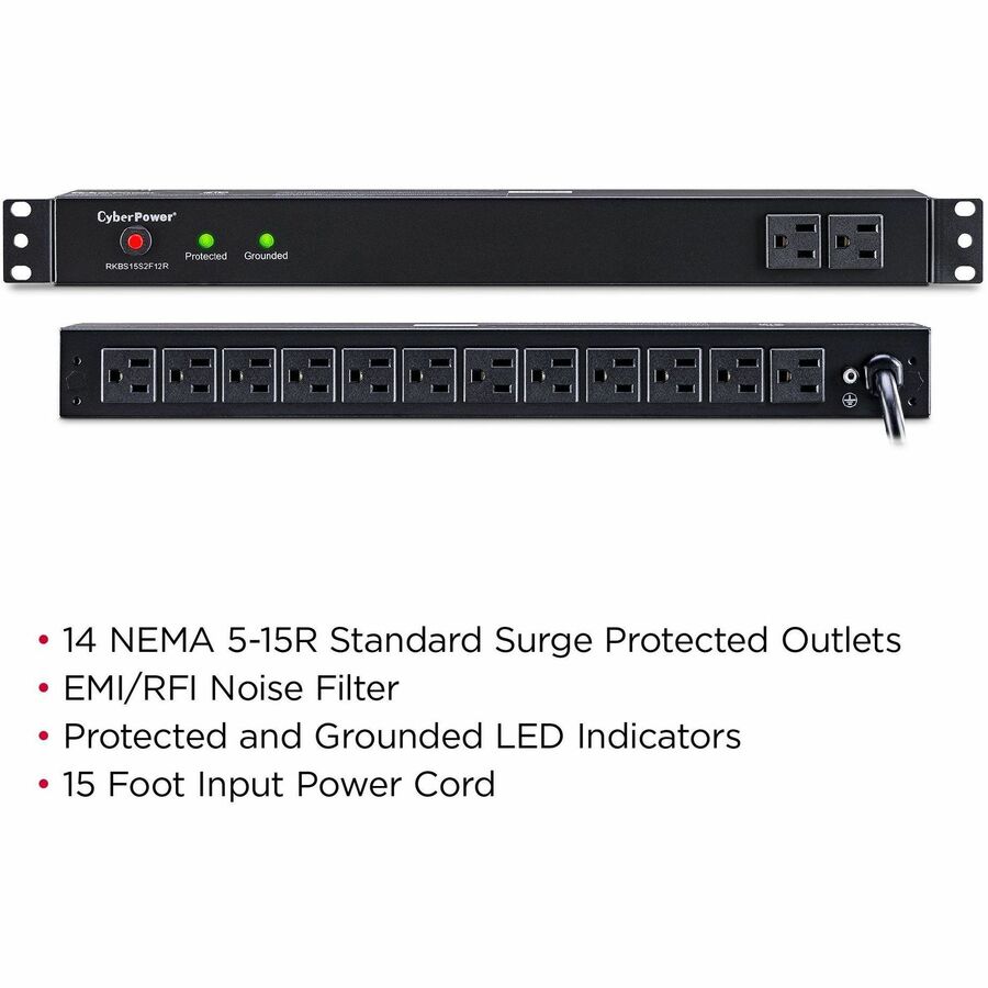 The CyberPower 14-outlet (2 Front and 12 Rear) rack mounted Rackbar surge suppressor (RKBS15S2F12R) provides 120V 15A output and a surge suppression rating of 3,600 joules. It distributes power to 14 NEMA 5-15R receptacles from a single NEMA 5-15P plug. Designed for data centers and other electrically demanding applications, this unit has a rugged, industrial-grade metal housing and a 15-foot AC power cord. It can be mounted either horizontally or vertically, includes a cord retention tray and is ETL/RoHS certified. A lifetime warranty and ,150,000 Connected Equipment Guarantee ensures the Rackbar surge suppressor is free of defects in design, assembly, material or workmanship.