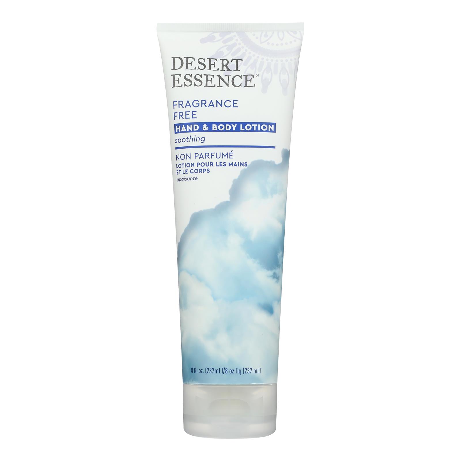 DESERT ESSENCE ORGANICS FRAGRANCE FREE SOOTHING HAND AND BODY LOTION CAN BE USED DAILY TO MOISTURIZE SKIN. MADE WITH SUNFLOWER AND ORGANIC JOJOBA OILS AND FAIR TRADE ORGANIC SHEA BUTTER, THIS LOTION WILL DEEPLY MOISTURIZE YOUR SKIN LEAVING IT SOFT AND SILKY. OUR LOTION IS 100% VEGAN, CRUELTY-FREE, BIODEGRADABLE, AND FREE OF GLUTEN AND WHEAT. IT IS ALSO FREE OF PARABENS, SILICONE, AND ARTIFICIAL FRAGRANCES. EACH TUBE CONTAINS 8 FL. OZ. OF DESERT ESSENCE ORGANICS FRAGRANCE FREE SOOTHING HAND AND BODY LOTION. SEE LABEL FOR WARNINGS.