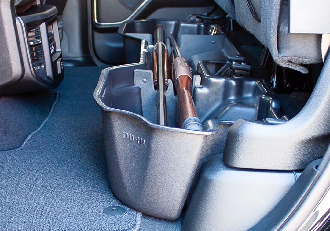 The DU-HA allows you to store your gear, guns, power tools, tow ropes, tie-down straps, first aid kit, tackle, bungee straps, hats, boots, gloves, chains, jumper cables, and so much more safely and securely under or behind the back seat of your truck.