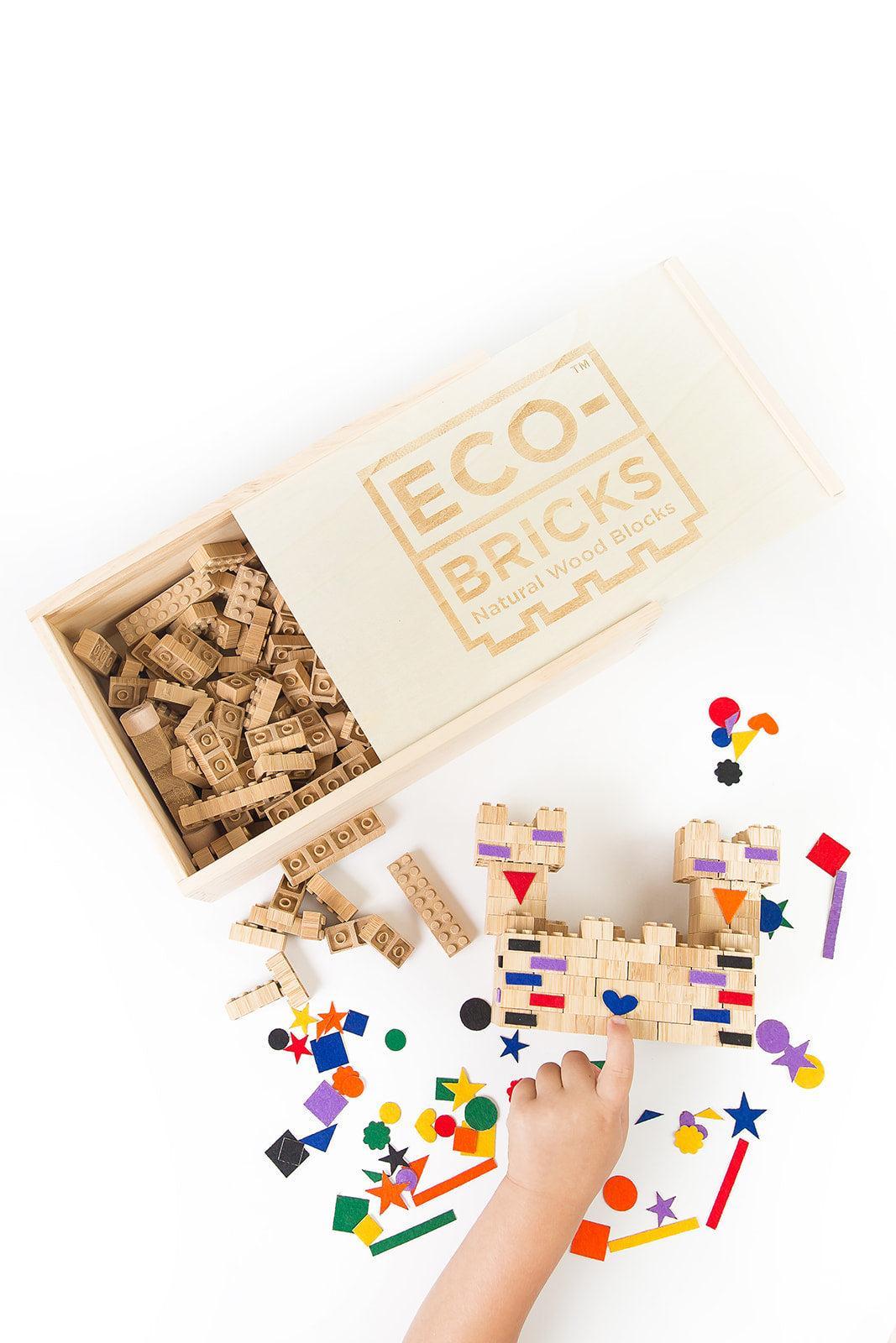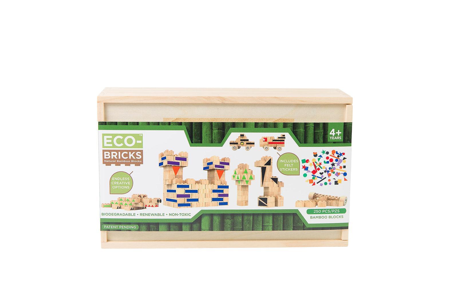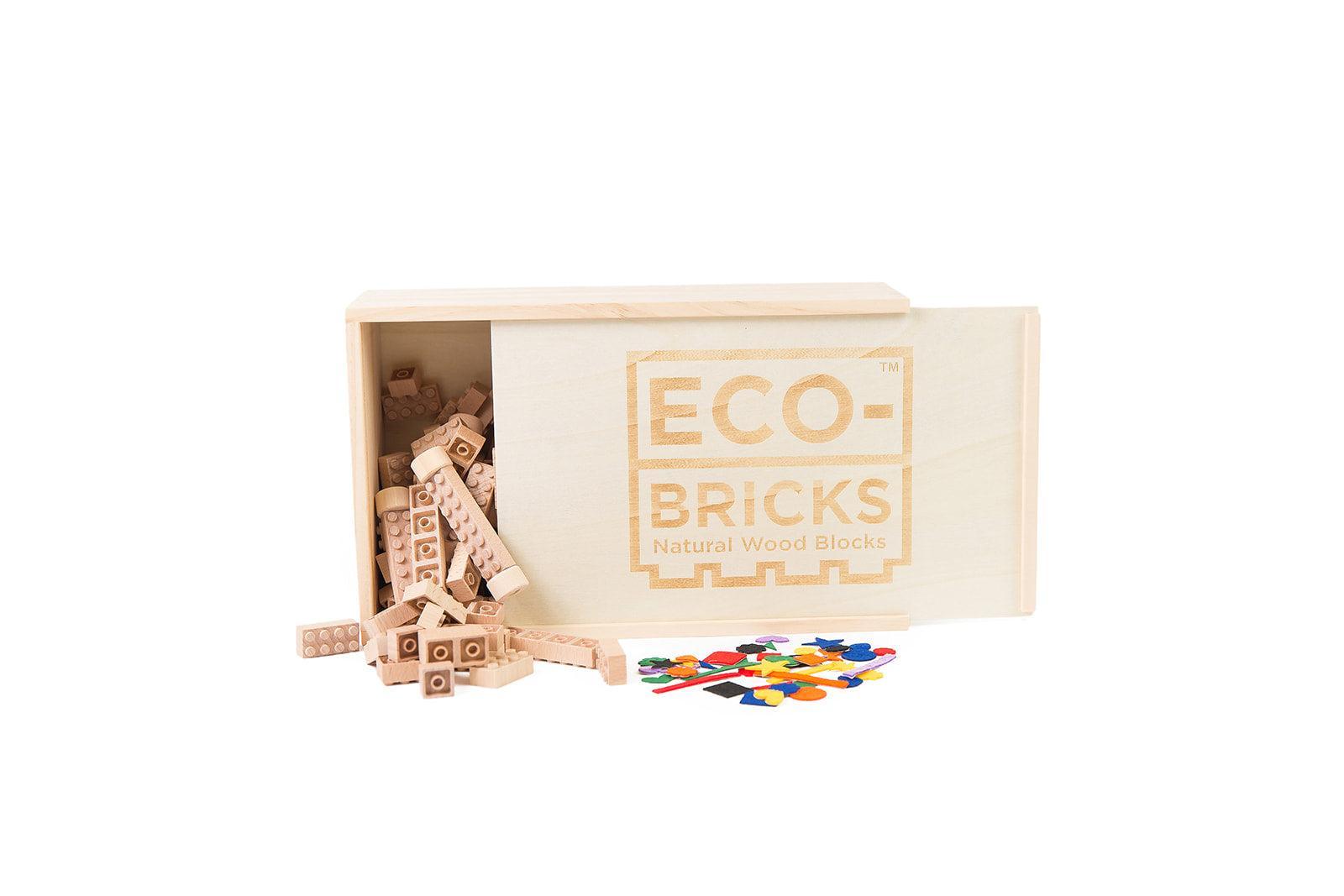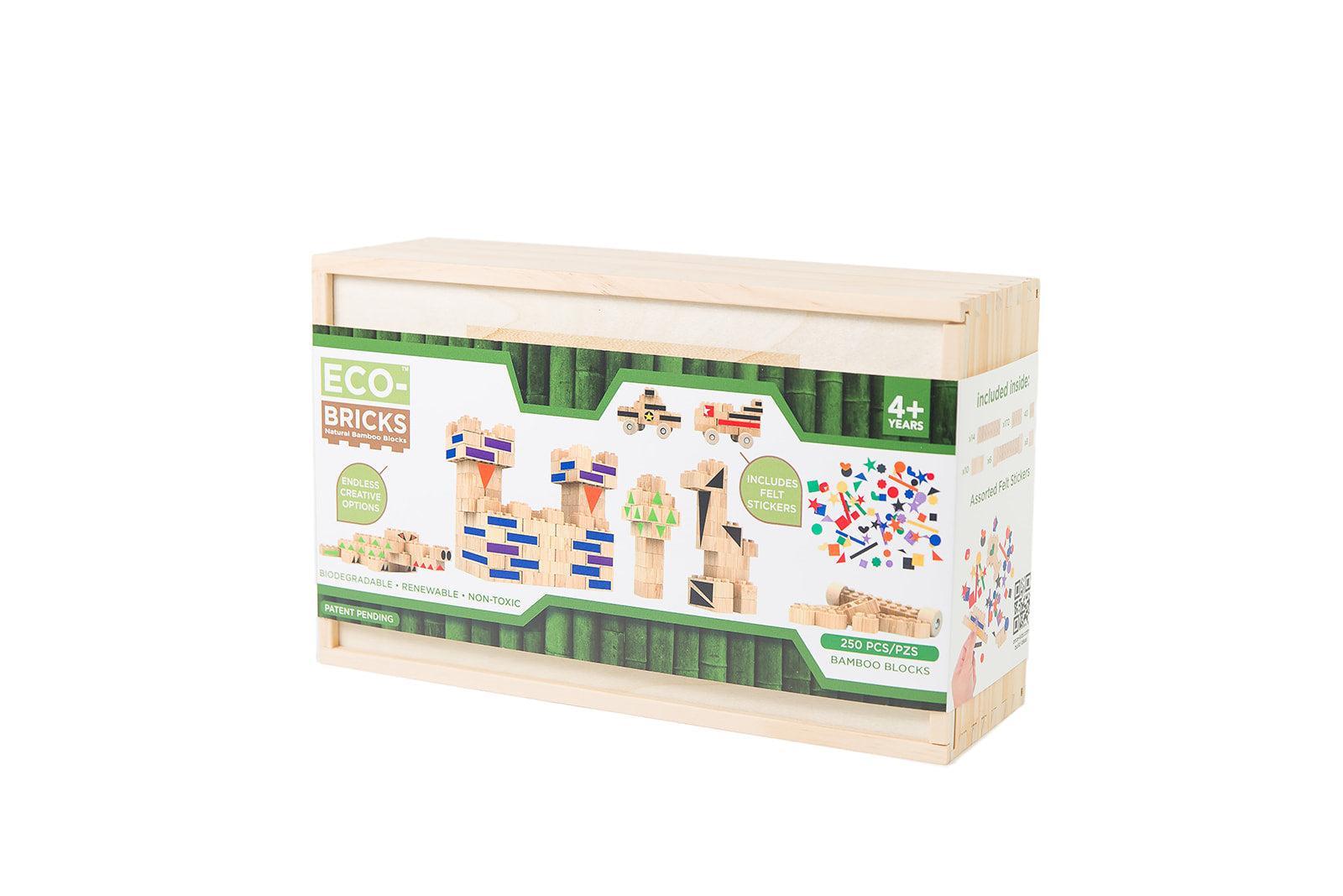 Eco-bricks™ Bamboo + felt sets are natural and biodegradable bamboo construction blocks and come with adhesive felt shapes that add an additional layer for sensory development and customization. These removable felt-shaped stickers are spun from recycled plastic bottles, therefore, sustainable, too! Durable, beautifully crafted, and even compatible with most of the other major interlocking block brands (so you don’t have to start your whole collection all over again), the Eco-Bricks™ Bamboo 250-Piece set is a brilliant first step into healthier, greener, construction block fun. Benefits: Bamboo has antimicrobial properties – stays clean in high use! Bamboo is also fast-growing and carbon neutral These interlocking blocks aren’t just fun – they are friendly to the planet, too! Features: Made from precision-carved natural bamboo and recycled plastic bottles spun felt-shaped stickers Compatible with plastic blocks Encourages fine motor skills and environmental awareness Assorted style blocks for endless design configurations High-quality design for lasting durability Recommended Age 4+ Includes: 8 – 4 Dot Bamboo Covers 40 – 4 Dot Bamboo Blocks 172 – 8 Dot Bamboo Blocks 10 – 8 Dot Bamboo Covers 14 – 16 Dot Bamboo Bases 6 – 16 Dot Axel with Wheels Removable felt shaped stickers Packaged in a laser engraved wooden storage box. WARNING: CHOKING HAZARD – Small parts. Not intended for children under 3 years. Our mission at Once-Kids is to make toys that kids make their own while helping save our world’s oceans.