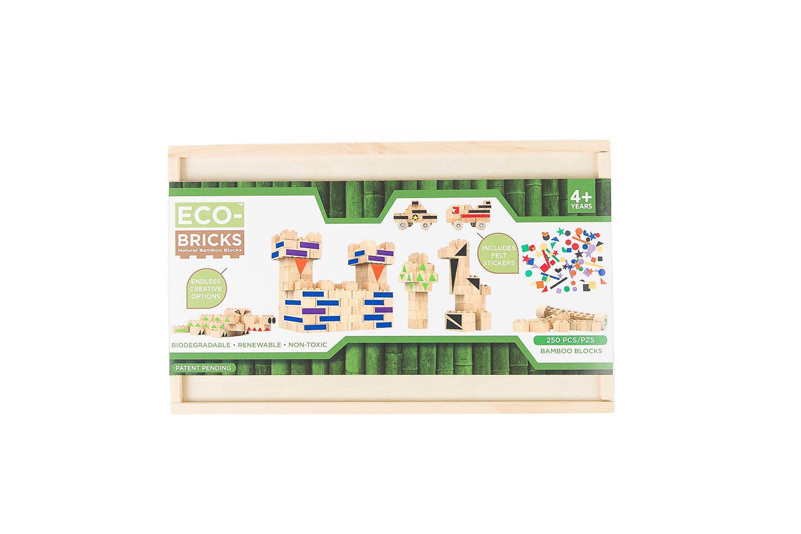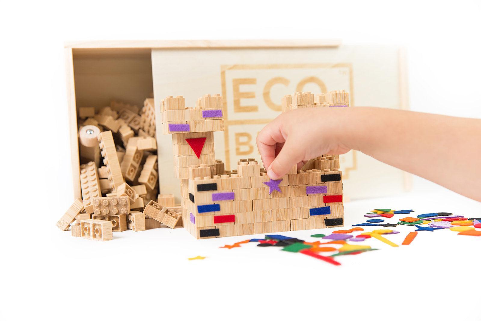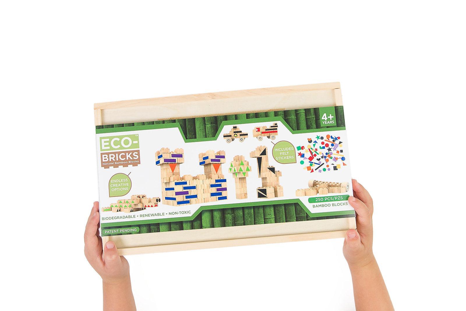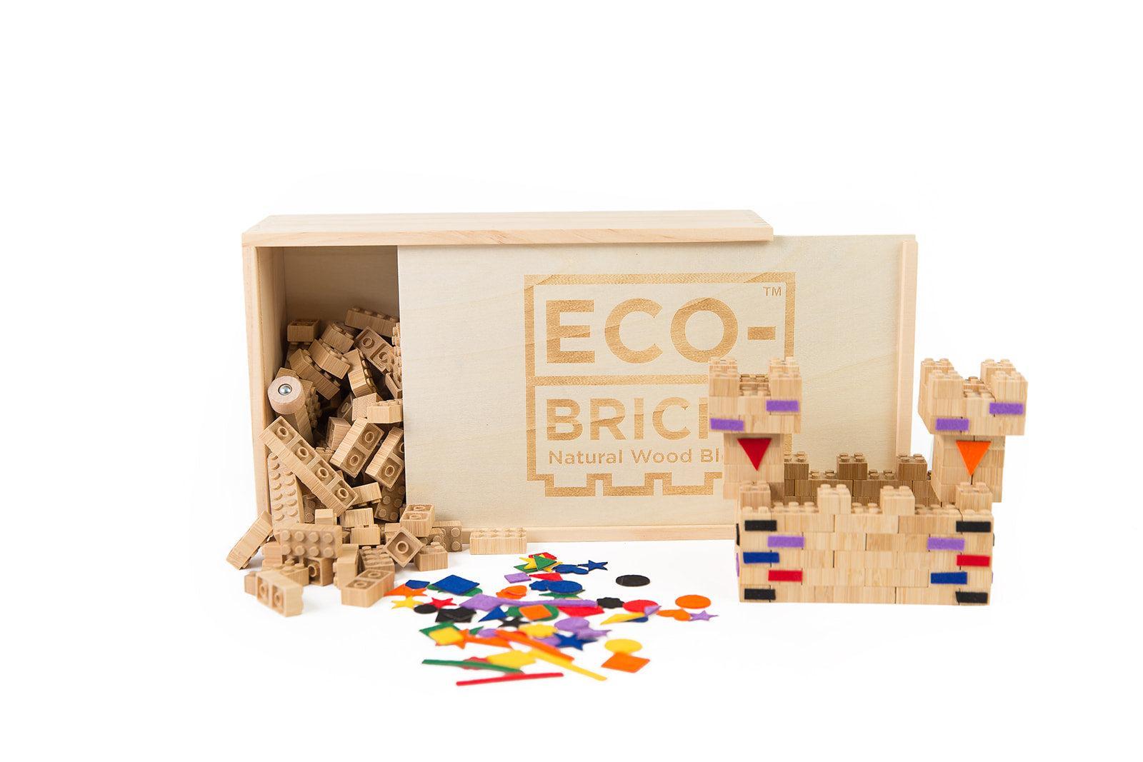 Eco-bricks™ Bamboo + felt sets are natural and biodegradable bamboo construction blocks and come with adhesive felt shapes that add an additional layer for sensory development and customization. These removable felt-shaped stickers are spun from recycled plastic bottles, therefore, sustainable, too! Durable, beautifully crafted, and even compatible with most of the other major interlocking block brands (so you don’t have to start your whole collection all over again), the Eco-Bricks™ Bamboo 250-Piece set is a brilliant first step into healthier, greener, construction block fun. Benefits: Bamboo has antimicrobial properties – stays clean in high use! Bamboo is also fast-growing and carbon neutral These interlocking blocks aren’t just fun – they are friendly to the planet, too! Features: Made from precision-carved natural bamboo and recycled plastic bottles spun felt-shaped stickers Compatible with plastic blocks Encourages fine motor skills and environmental awareness Assorted style blocks for endless design configurations High-quality design for lasting durability Recommended Age 4+ Includes: 8 – 4 Dot Bamboo Covers 40 – 4 Dot Bamboo Blocks 172 – 8 Dot Bamboo Blocks 10 – 8 Dot Bamboo Covers 14 – 16 Dot Bamboo Bases 6 – 16 Dot Axel with Wheels Removable felt shaped stickers Packaged in a laser engraved wooden storage box. WARNING: CHOKING HAZARD – Small parts. Not intended for children under 3 years. Our mission at Once-Kids is to make toys that kids make their own while helping save our world’s oceans.