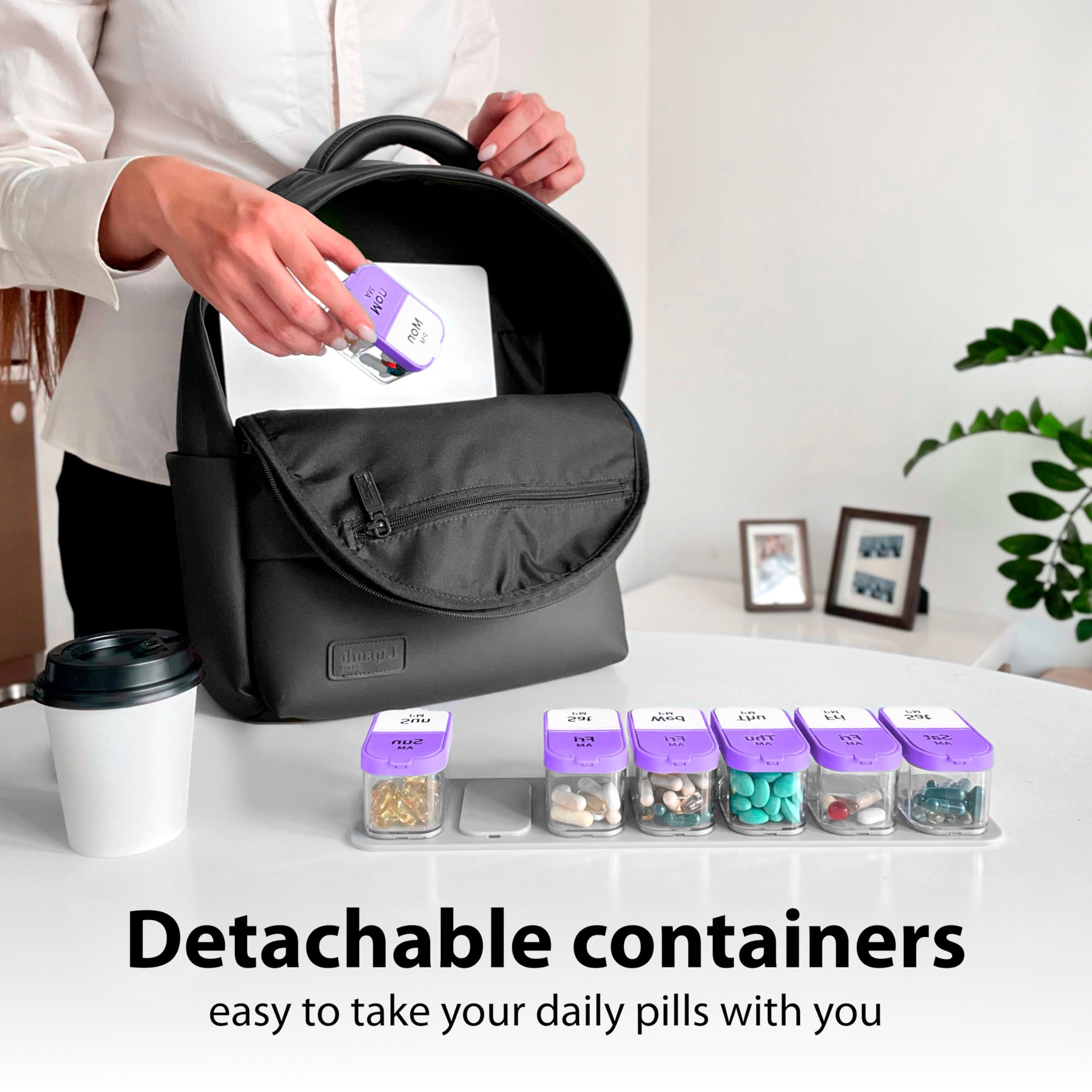 7 Removable Containers Featuring 7 detachable compartments, this xl pill box 7 day offers ultimate flexibility. Store your full supply on the stand and take only the container you need with you
