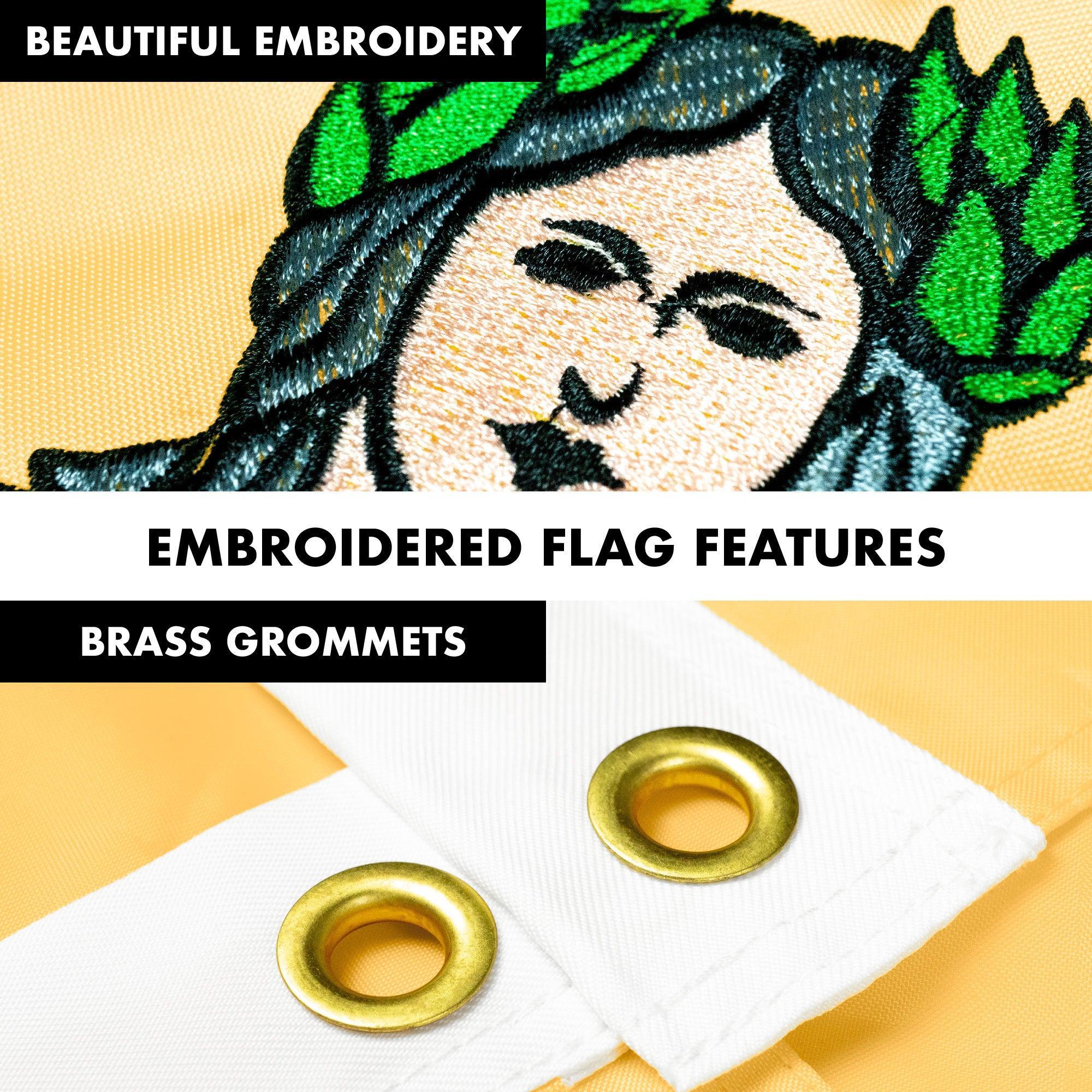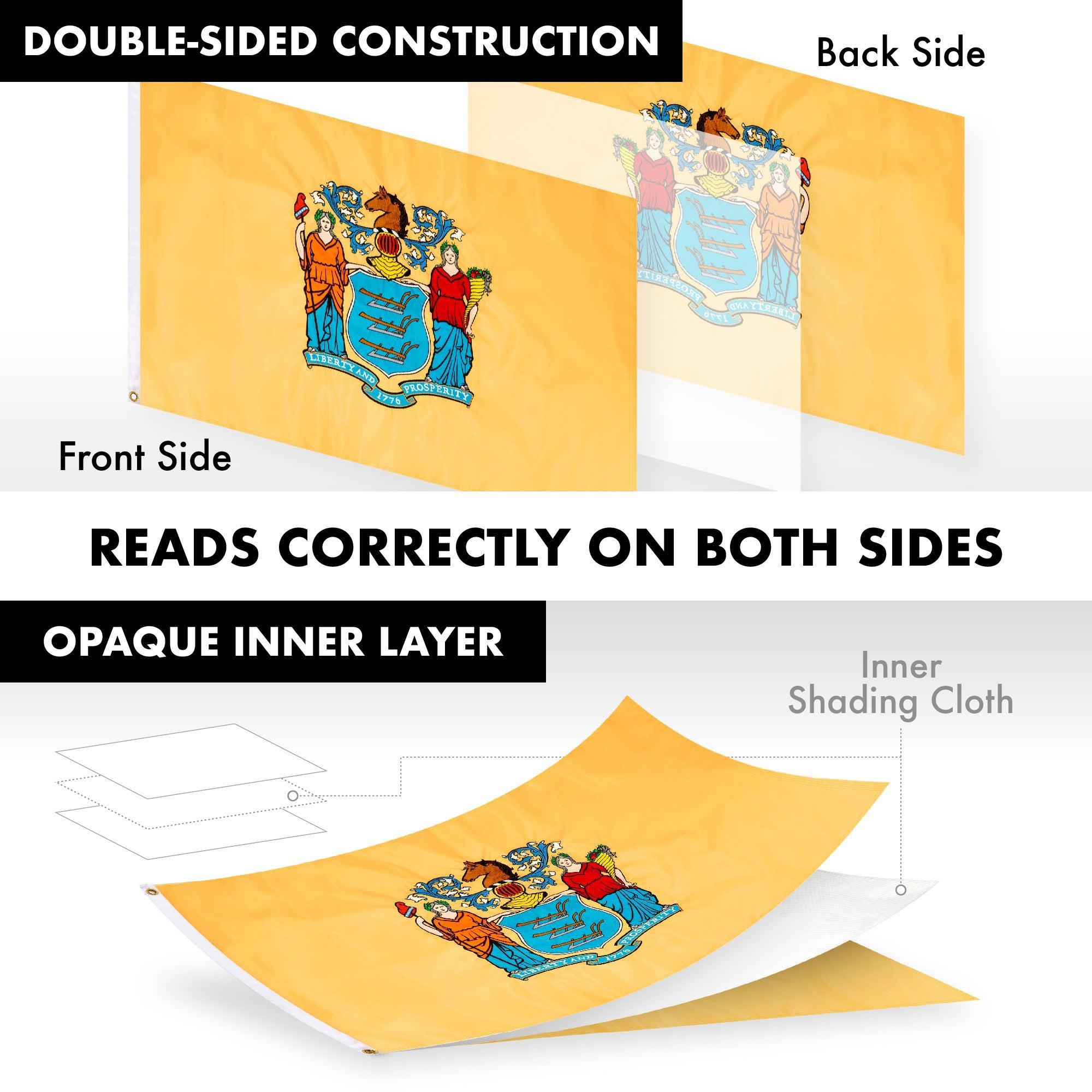 SPECS: 6 ft (72 in) aluminum flag pole, 210D Polyester 3×5 ft New Jersey embroidered double-sided flag with brass grommets. This flag displays the correct design from either side! Imported, 100% Polyester Flag