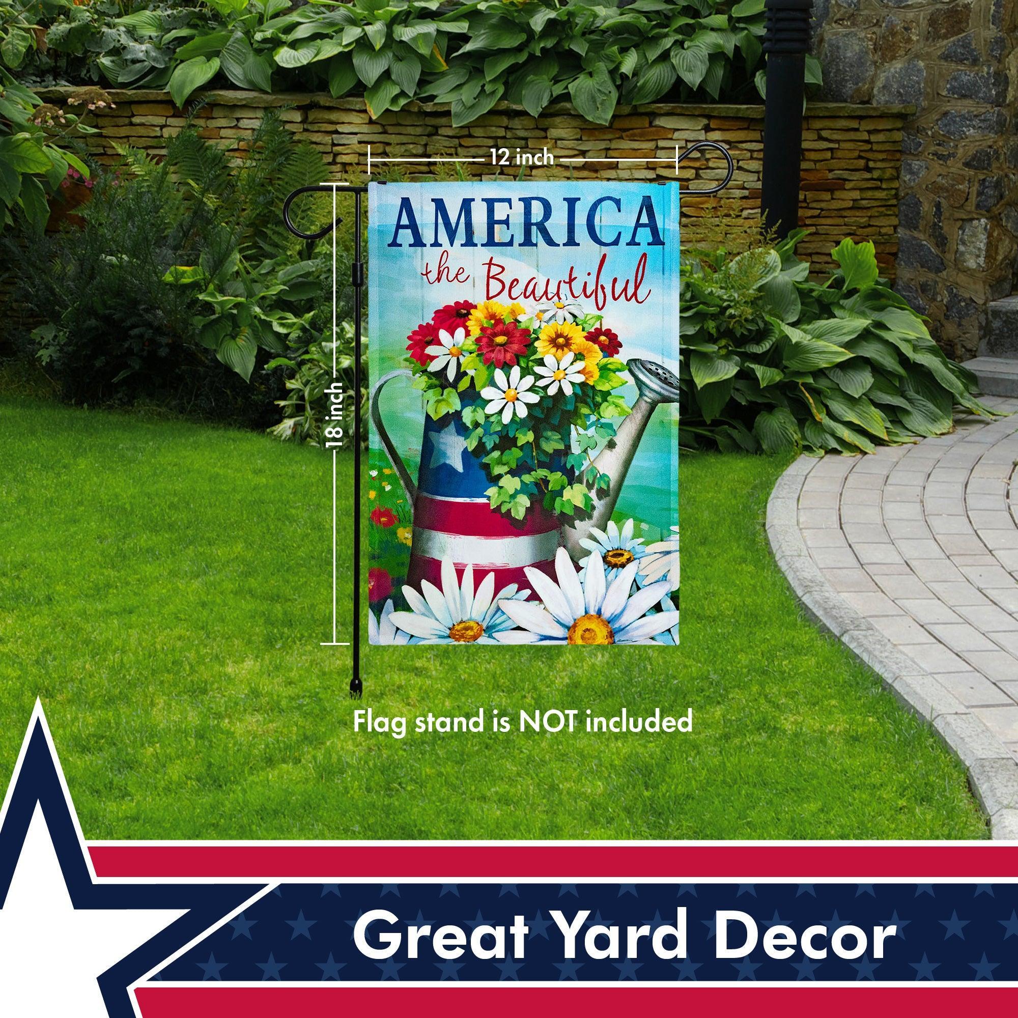 G128 – America the Beautiful USA Spring Flowers & Watering Can Patriotic Garden Flag | 12×18 Inch | Printed 150D Polyester – Rustic Holiday Seasonal Outdoor Flag