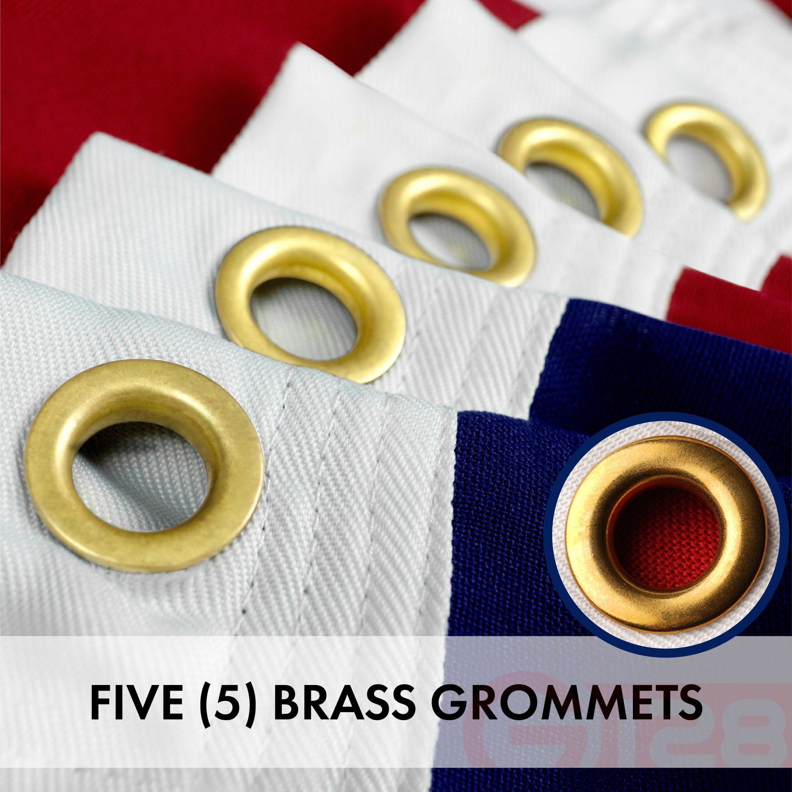 - Flag has richly embroidered white stars and sewn stripes with 4 rows of double-needle lock-stitching on the fly hem. The heading is a heavy duty polyester canvas with 5 solid brass grommets for easy hanging and display. This flag is 10×15 Ft. Imported.