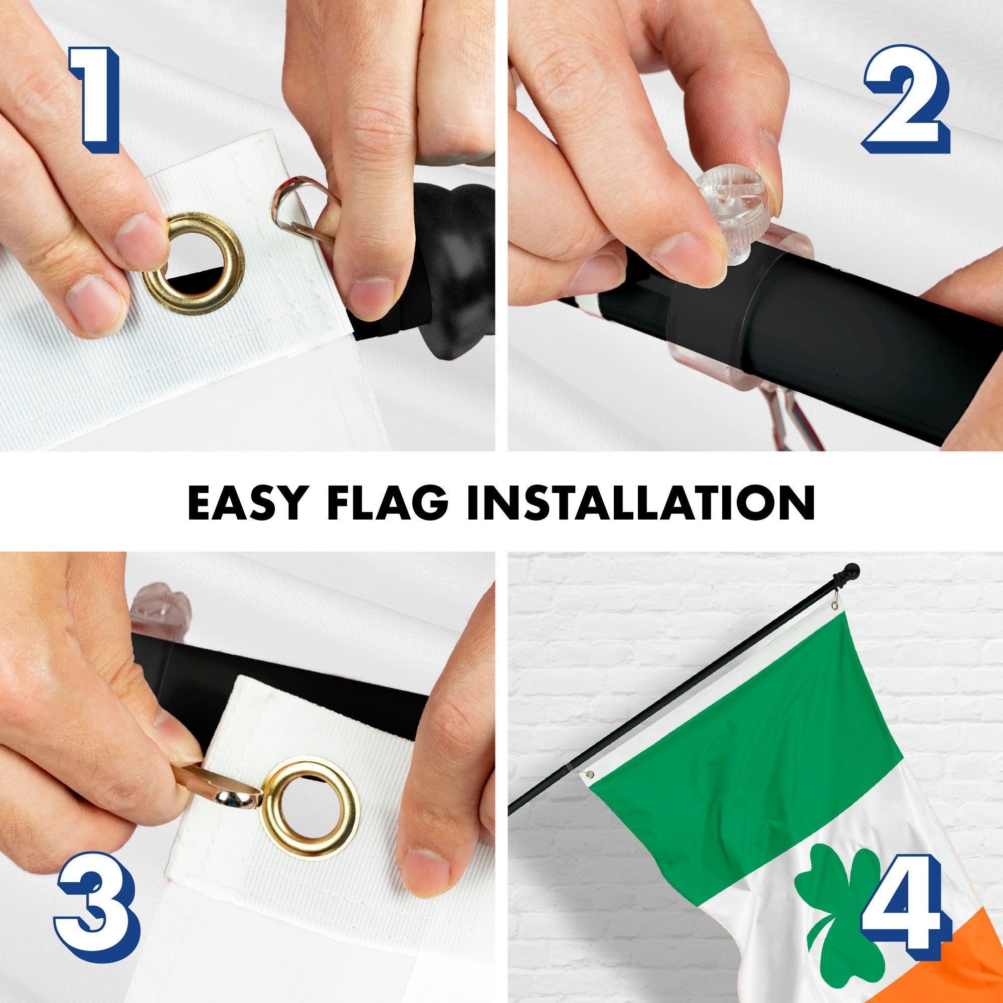 SPECS: 6 ft (72 in) aluminum flag pole, Polyester 3×5 ft Ireland printed 150D flag with brass grommets. Imported, 100% Polyester Flag