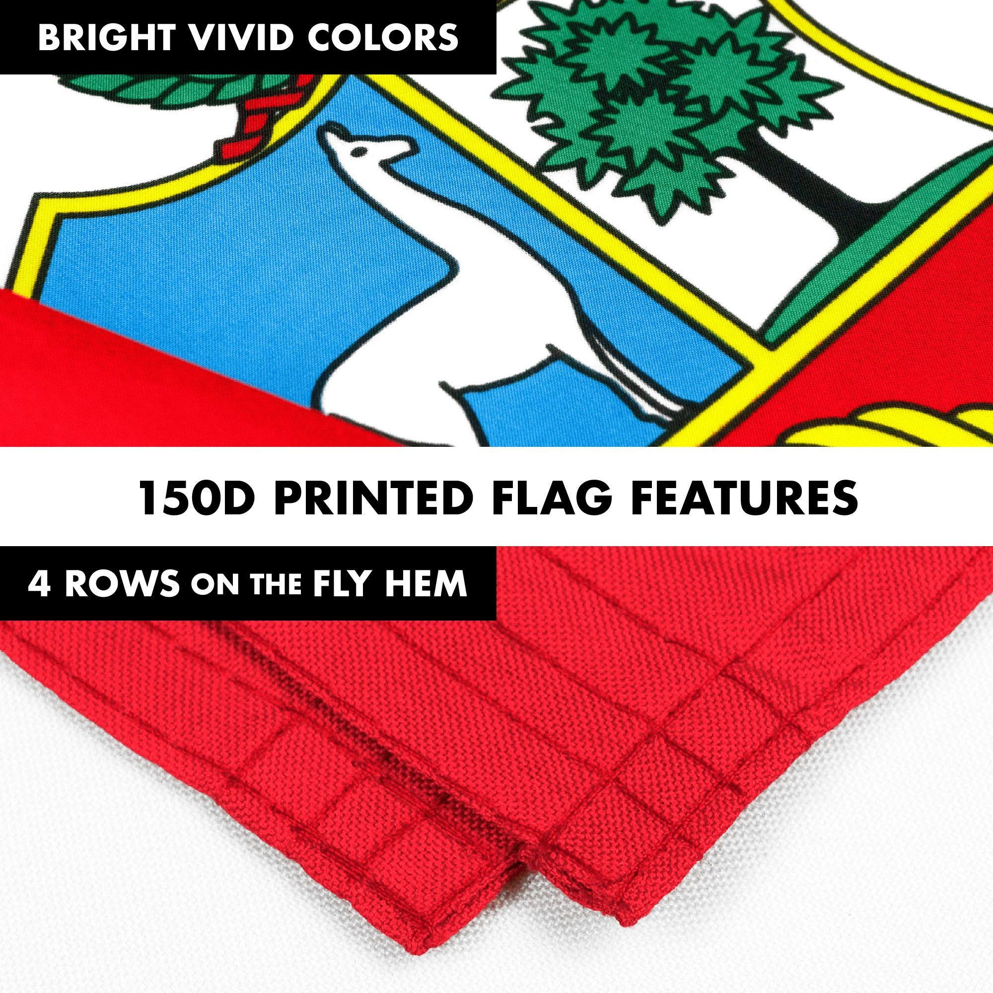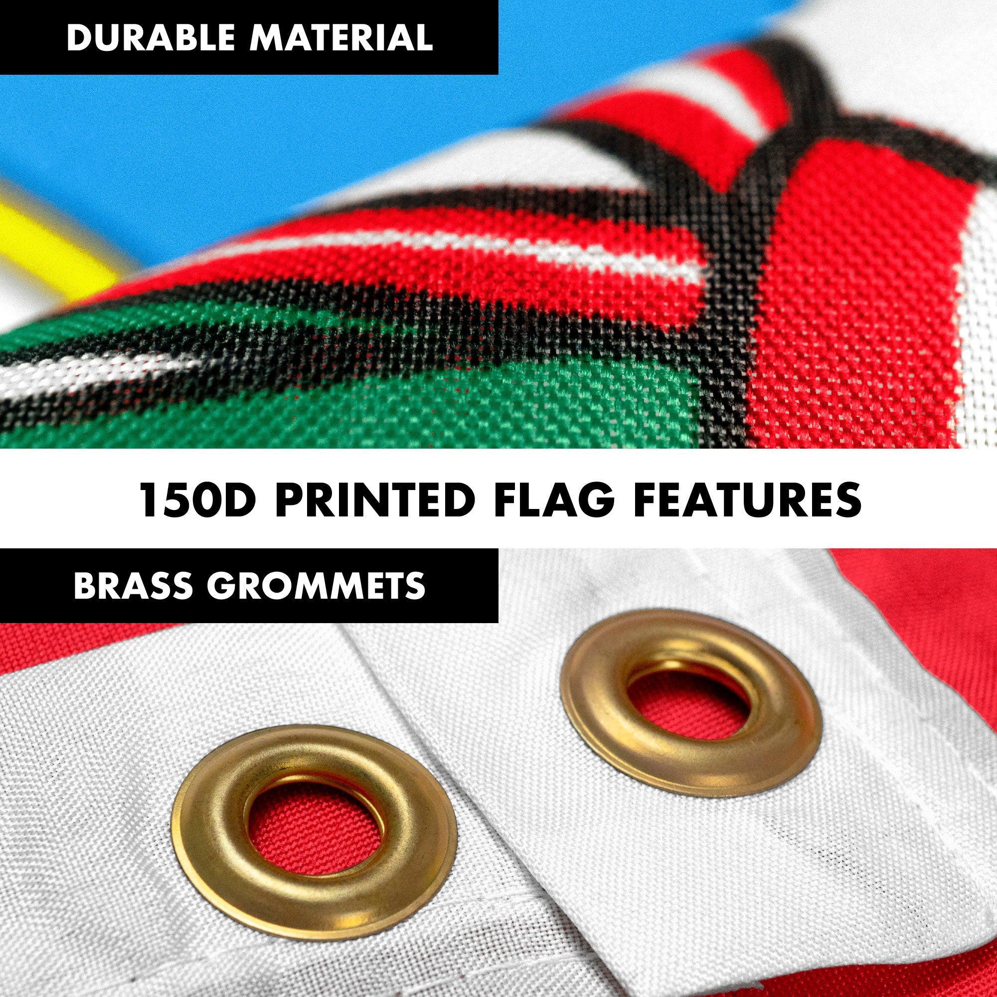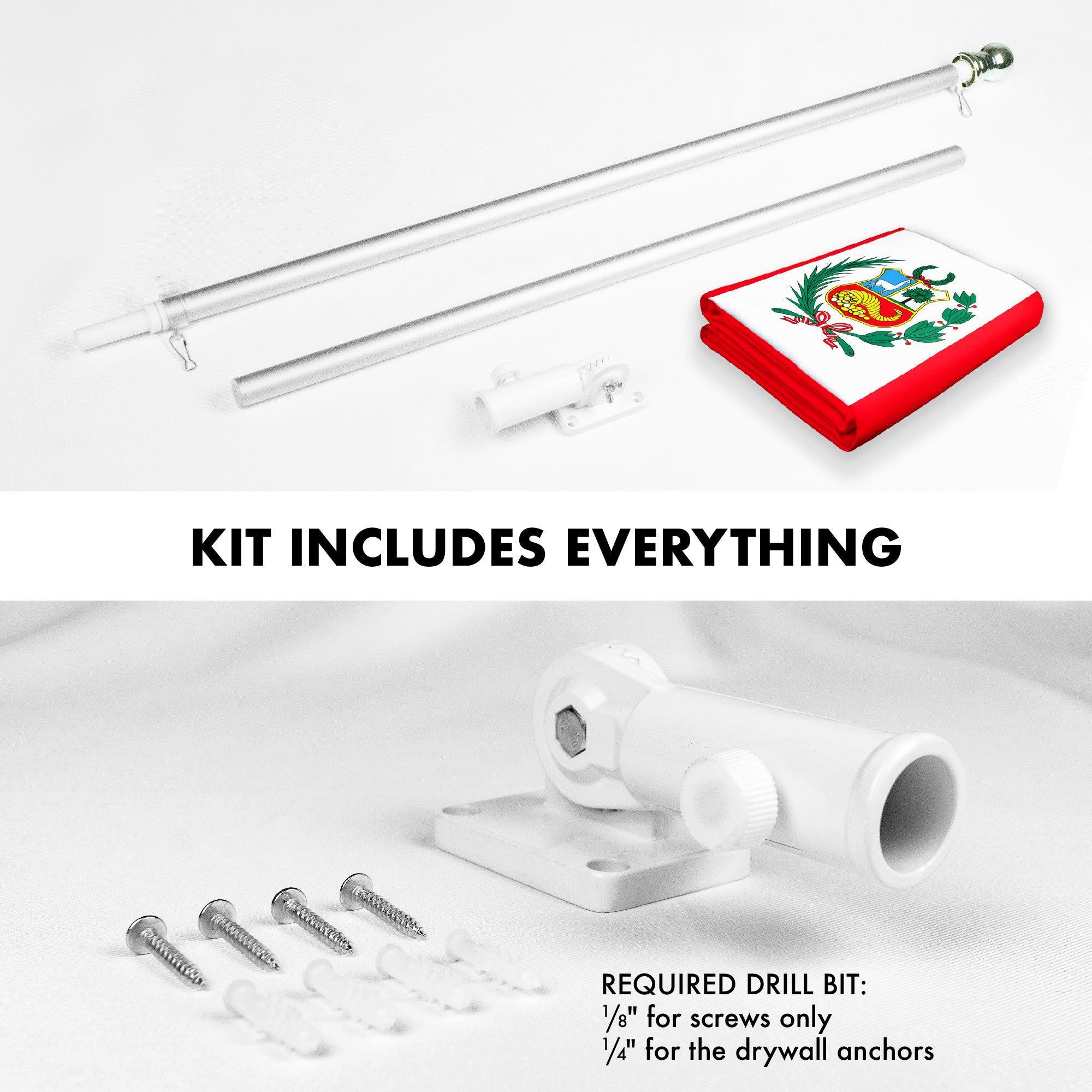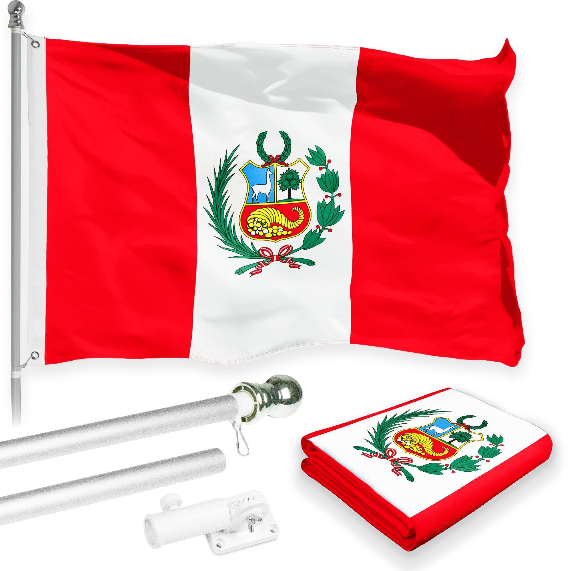 SPECS: 6 ft (72 in) aluminum flag pole, Polyester 3×5 ft Peru printed 150D flag with brass grommets. Imported, 100% Polyester Flag