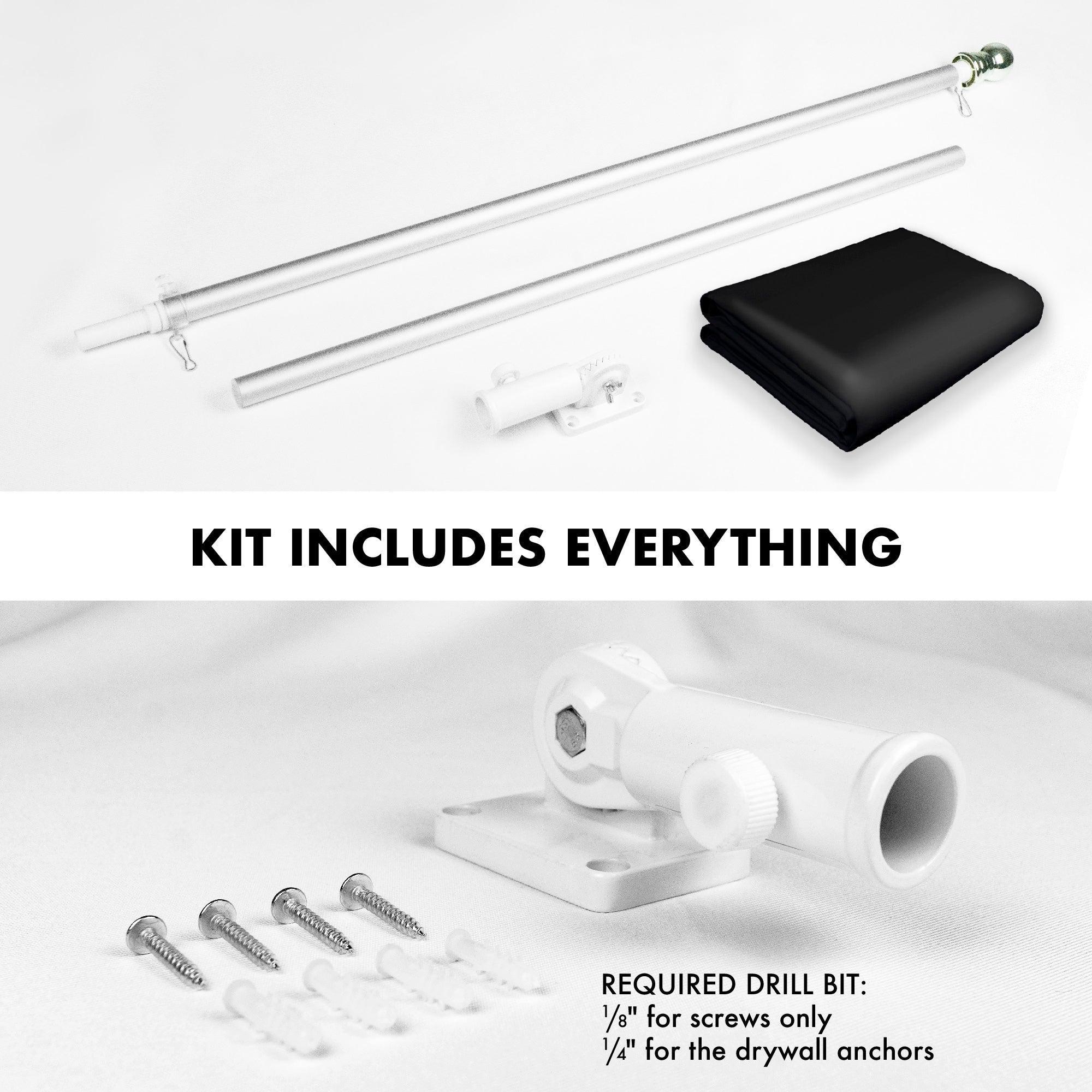 SPECS: 6 ft (72 in) aluminum flag pole, Polyester 3×5 ft Black printed 150D flag with brass grommets. Imported, 100% Polyester Flag