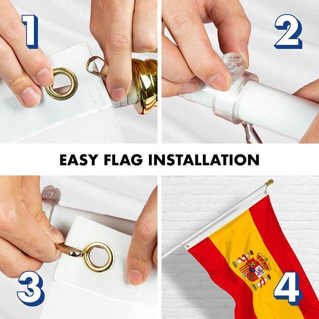 SPECS: 6 ft (72 in) aluminum flag pole, Polyester 3×5 ft Spain printed 150D flag with brass grommets. Imported, 100% Polyester Flag