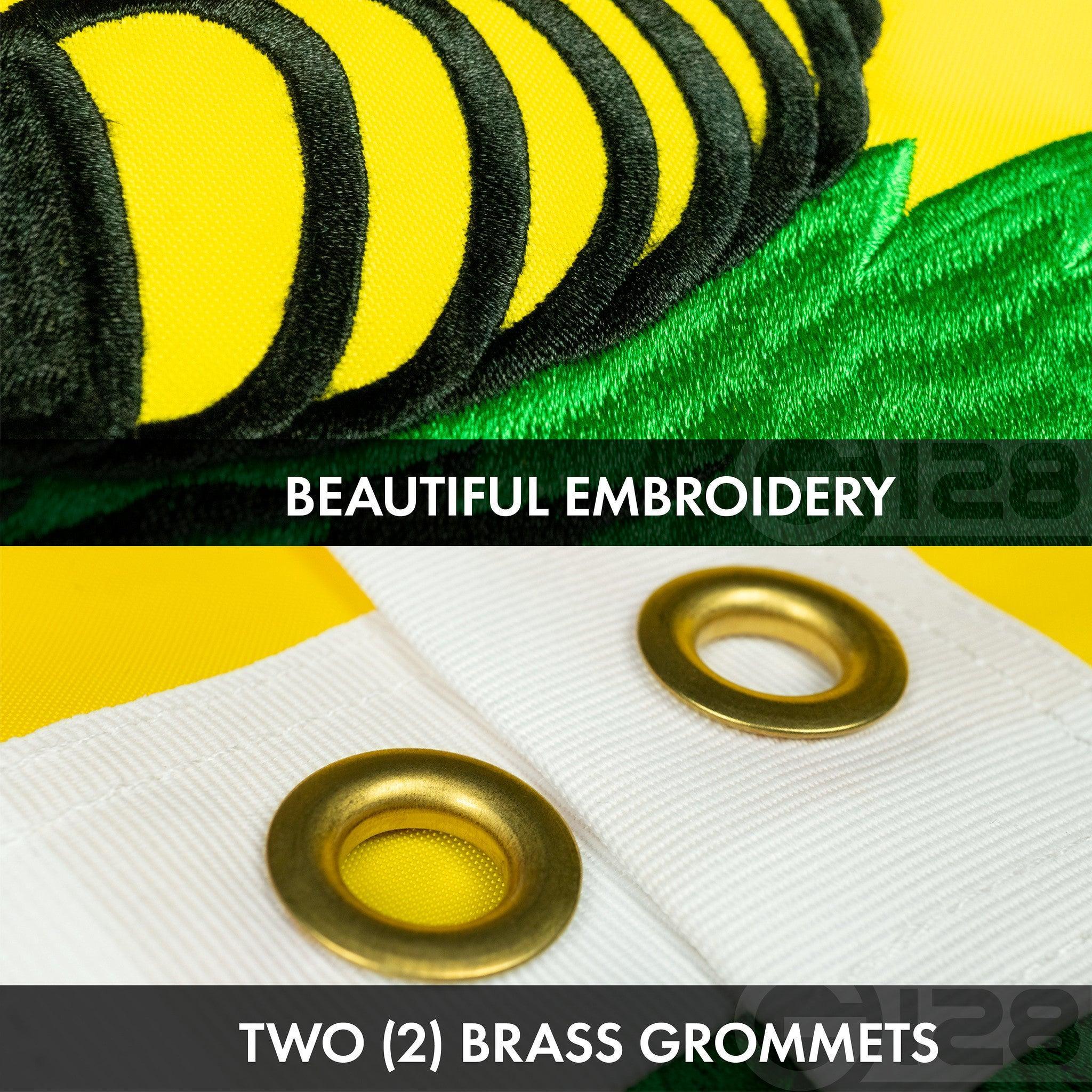 BOTH flags are exquisitely embroidered with bright enriched thread and fly ends are secured with FOUR rows of lock stitching to prevent ripping and tearing.Heavy duty polyester canvas heading with two strong solid brass grommets.