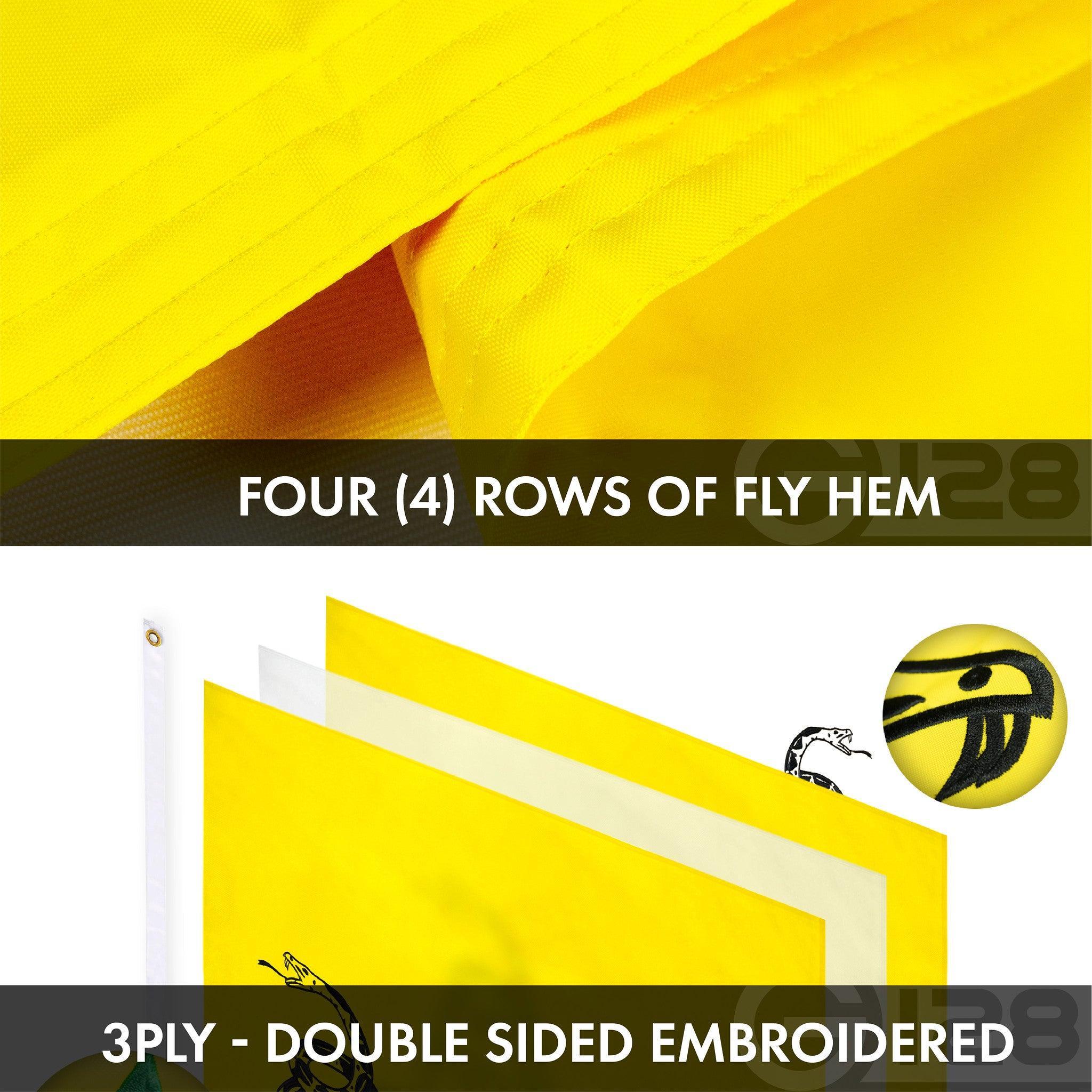 The American flag is made from ONE layer of 100% 210 Denier fabric. The Gadsden flag is DOUBLE SIDED 3ply made from TWO complete 100% 210 Denier fabric flags sewn together with one piece of shading cloth in between so images are not obstructed from the reverse side. Imported. BOTH flags fly in medium and strong winds.