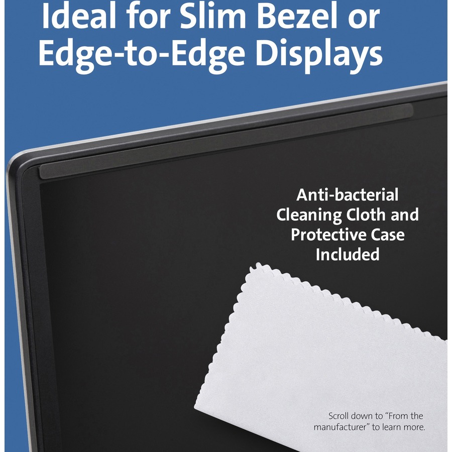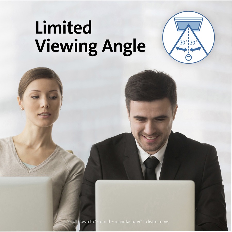 Laptop privacy screen features a magnetic strip to provide a damage-free way to prevent others from viewing your screen. Thin construction allows you to close your laptop and enter sleep mode without removal. Limited viewing angle narrows the field of vision to around 30 degrees to help keep the information on your screen private and reduce the chances of a visual data breach. Blue light reduction filters out harmful rays by up to 22 percent to ease eyestrain and reduce the chances of blue light interrupting natural sleep patterns. Low reflective coating reduces glare from outside light sources for improved viewing clarity. Reversible viewing has a matte finish on one side to reduce glare and fingerprints. The other side is glossy to provide a clearer view of your screen.