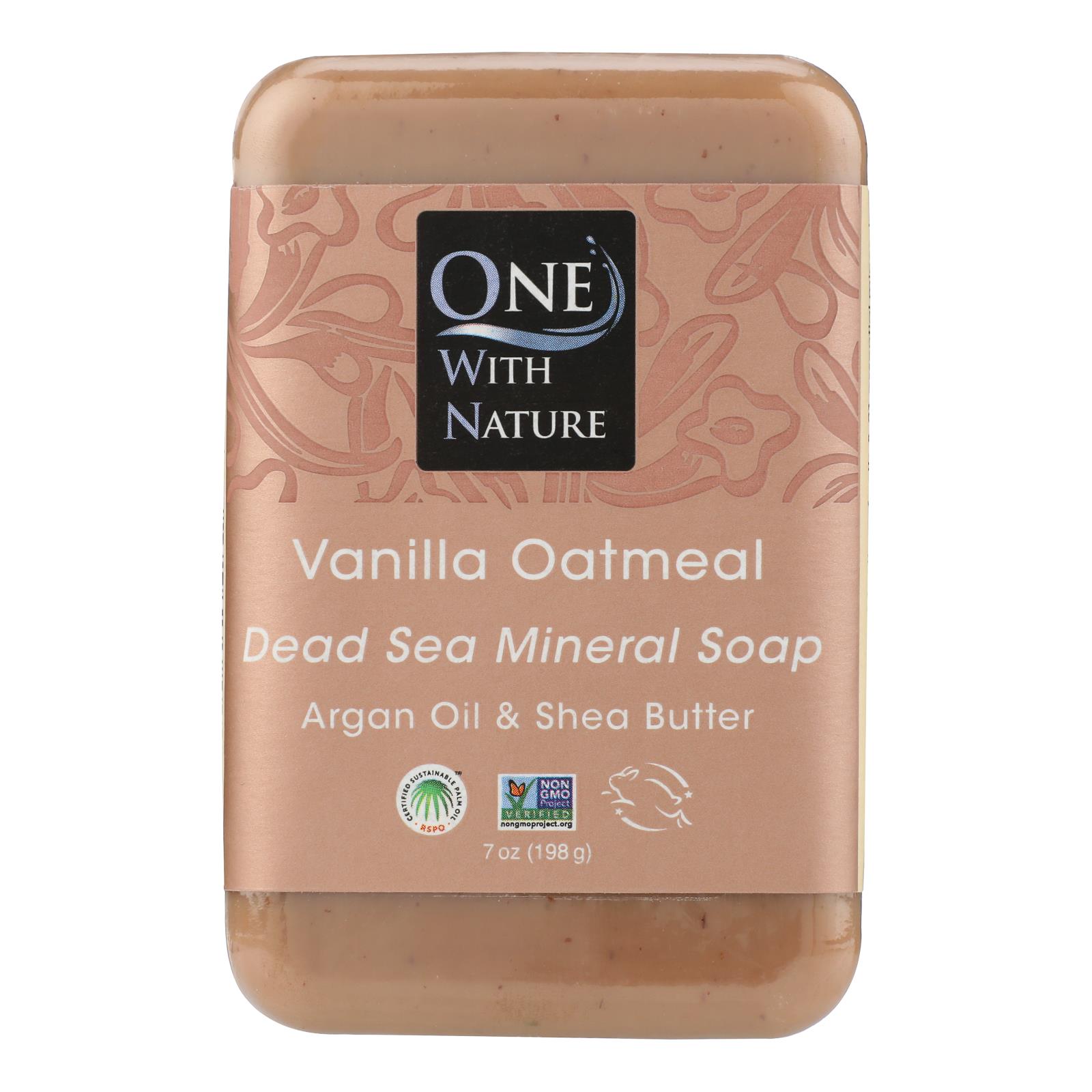 ONE WITH NATURE DEAD SEA BAR SOAP VANILLA OATMEAL IS A GENTLE YET POWERFUL SOAP. MADE WITH PRIMARILY WITH NATURALLY DERIVED INGREDIENTS, THIS SOAP IS LARGELY FREE OF UNNATURAL ADDITIVES. THIS PRODUCTS CONTAINS MOISTURIZING SHEA BUTTER AND ARGAN OIL. EACH BAR OF ONE WITH NATURE DEAD SEA BAR SOAP VANILLA OATMEAL WEIGHS 7 OZ.