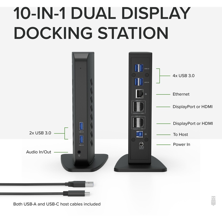 - Flexible Expandability – This USB laptop dock provides dual HDMI or DisplayPort video outputs, wired Gigabit Ethernet, 3.5mm combination audio jack, and six USB 3.0 ports. Includes both USB 3.0 and USB-C cables for flexible host connectivity