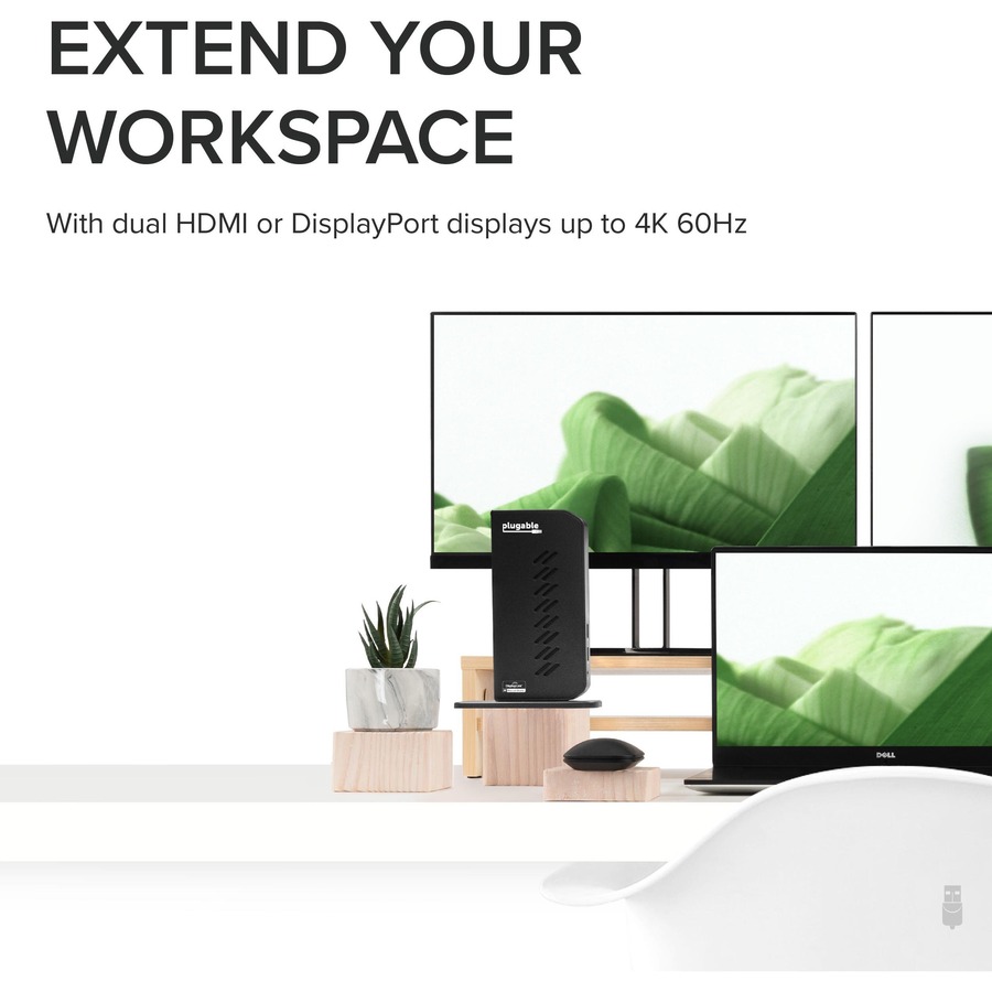 Featuring the latest DisplayLink DL-6950 chipset, the Plugable UD-6950Z docking station lets you connect two external monitors up to a 4K@60Hz resolution using DisplayPort or HDMI to your Windows laptop, or desktop via USB 3.0. Additionally, the UD-6950Z dock allows you to connect up to eight accessories to the six USB 3.0 ports, a Gigabit Etherent connection and audio input/output port all through a single USB cable.