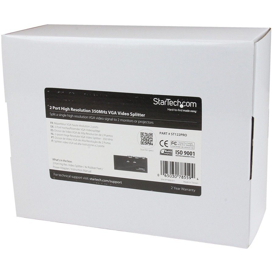 The ST122PRO 2 Port High Resolution VGA Video Splitter – 350 MHz splits a VGA video source signal to 2 monitors or projectors simultaneously – a professional grade solution that is perfect for presentations, classrooms, tradeshows, or in-store displays, where the highest quality video on several monitors is needed.