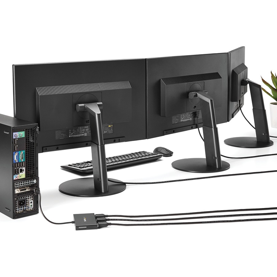 This MST hub lets you connect three HDMI monitors to your Mini DisplayPort computer. MST works on any Windows® device that supports DisplayPort 1.2, such as models of the Lenovo™ Think Pad® and Microsoft® Surface™. When connected to earlier revisions of DisplayPort, such as DP 1.1 the MST hub acts as a video splitter.