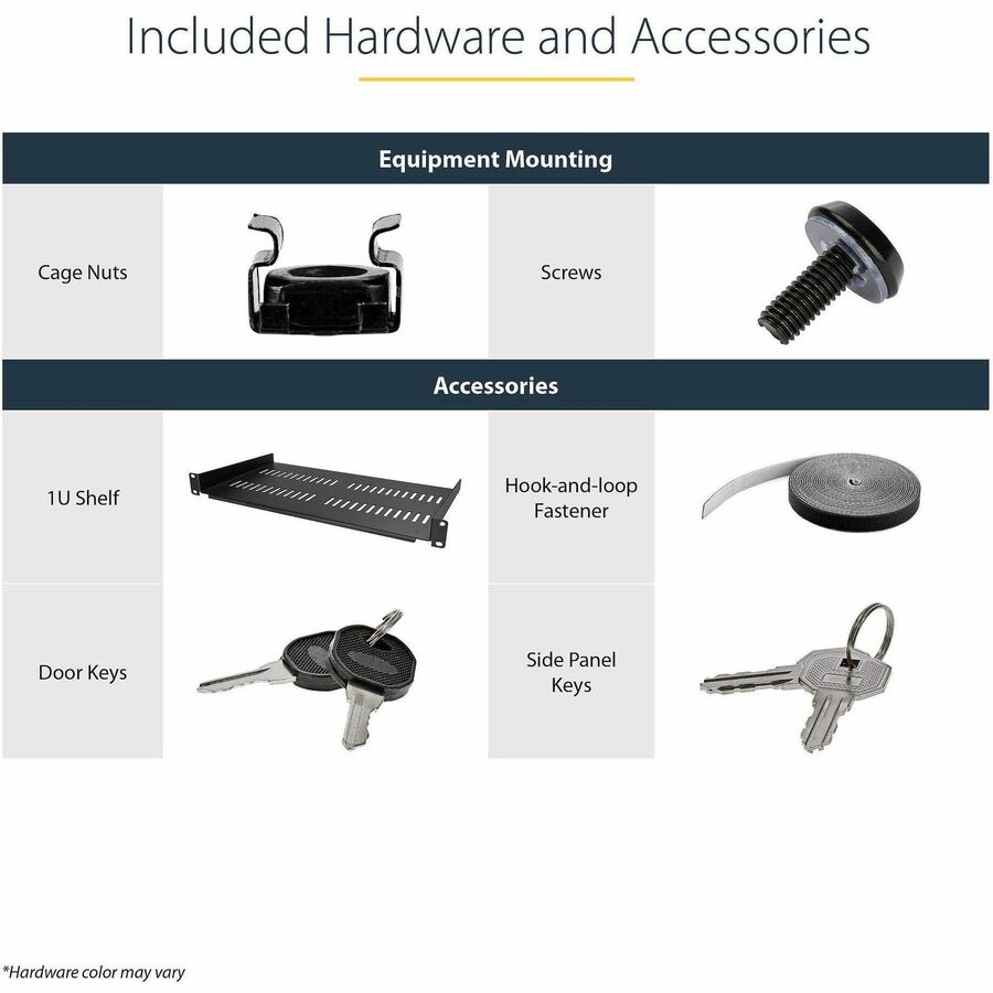 - FULLY ASSEMBLED: Swinging network cabinet ships fully assembled with all of the rack screws and cage nuts required to mount your equipment; Includes a shelf and a roll of hook-and-loop fastener; Wall-mount equipment cabinet is EIA/ECA-310-E Compliant