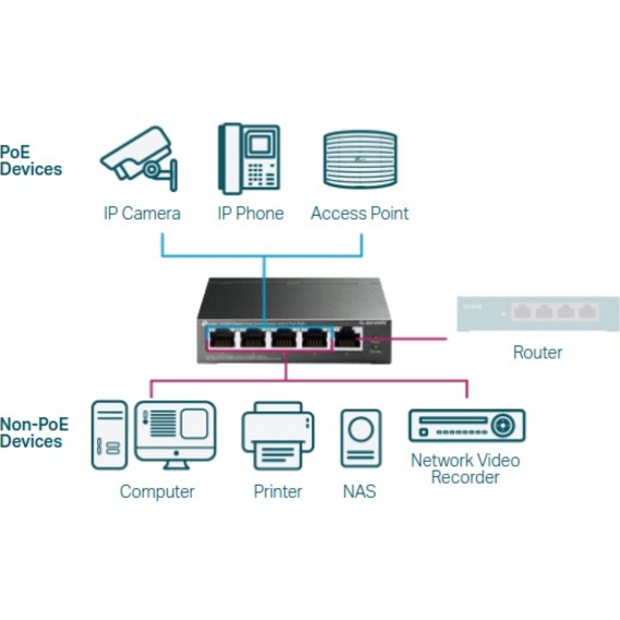 - Power Over Ethernet: 4� PoE+(802.3at/af) ports providing up to 30W per port, total PoE budget 65W.