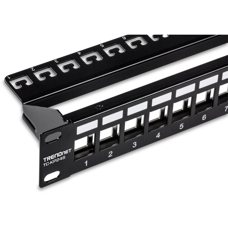 TRENDnet’s 24-Port Blank Keystone Shielded 1U Patch Panel, model TC-KP24S, is designed for use with TRENDnet’s Cat6A shielded keystone jack (TC-K06C6A). When used together, they create a patch panel solution suitable for gigabit and 10G Copper Ethernet network applications. Use this shielded patch panel with Cat6A shielded cabling, which is specifically designed to eliminate EMI and crosstalk ensuring peak performance and data integrity.