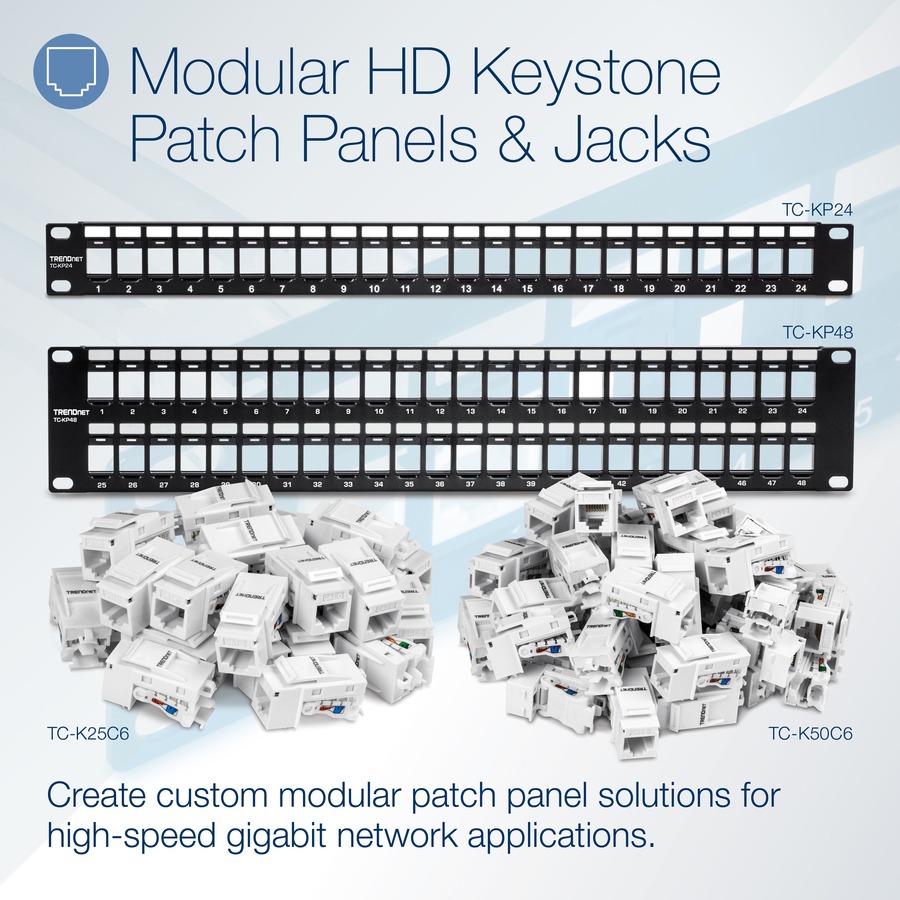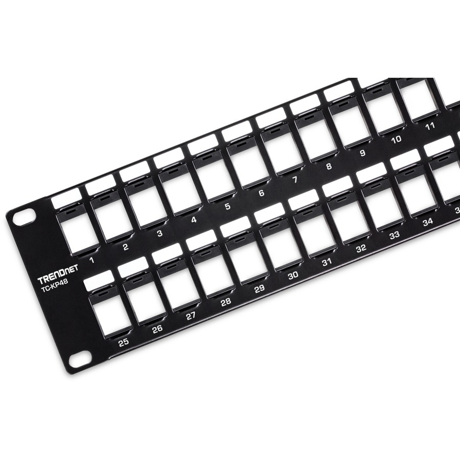 • BLANK KEYSTONE 2U PATCH PANEL: The 48-Port Blank Keystone 2U Patch Panel supports standard sized keystone jacks for audio video and data; Recommended to be used with TRENDnet’s Cat6 keystone jacks TC-K25C6 and TC-K50C6 (Sold Separately)