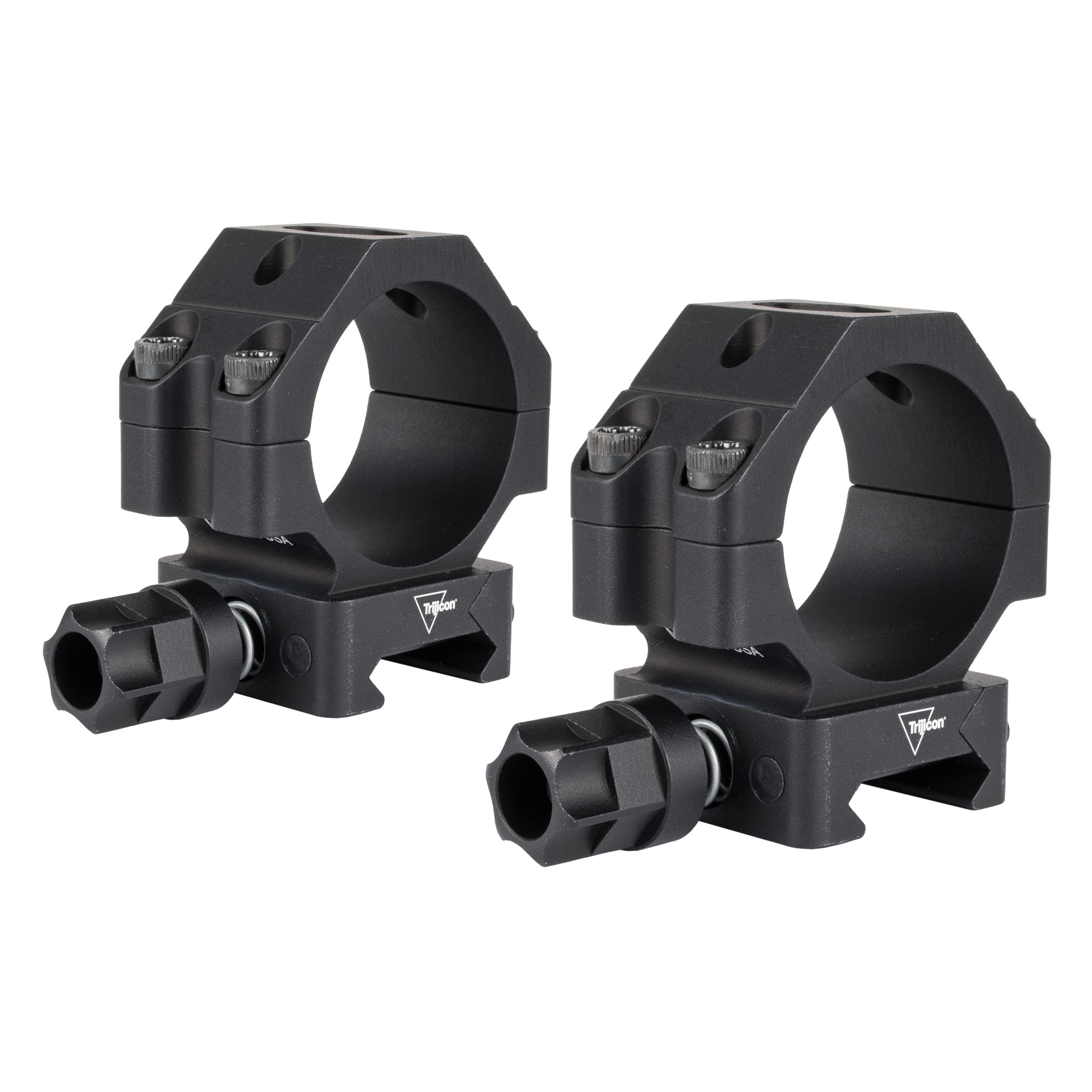 Trijicon Ring Mounts w/ Q-LOC Technology feature a 30mm tube, and are designed to keep the optic as low as possible for hunting and long range precision rifle applications. Featuring a Mil-Spec drop test rated 6061-T6 aluminum design and an easy to use one handed tool less mounting system. The spring-loaded design allows for constant retention and maintaining of zero even if the knobs are not tightened. The Ring mounts boast a low profile design with superior return to zero performance and are compatible with any Mil-Spec or NATO Picatinny rail.