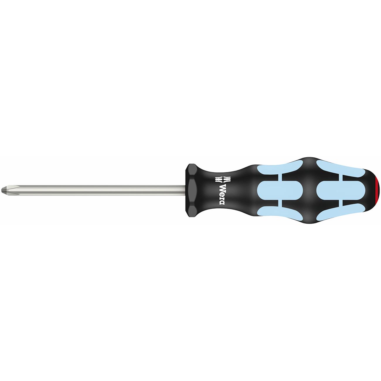 High quality Kraftform Plus screwdriver out of stainless steel. The stainless tools from Wera are vacuum ice-hardened and have the hardness and strength needed for screw connections. They can be used for industrial application without hesitation. The Lasertip tip literally bites into the head of the screw and thereby prevents any slipping out of the screw head. Multi-component Kraftform handle for fast and low-fatigue working. "e;Take it easy"e; Tool Finder: color coding according to profile and size. The hexagonal anti-roll feature prevents any bothersome rolling away at the workplace.