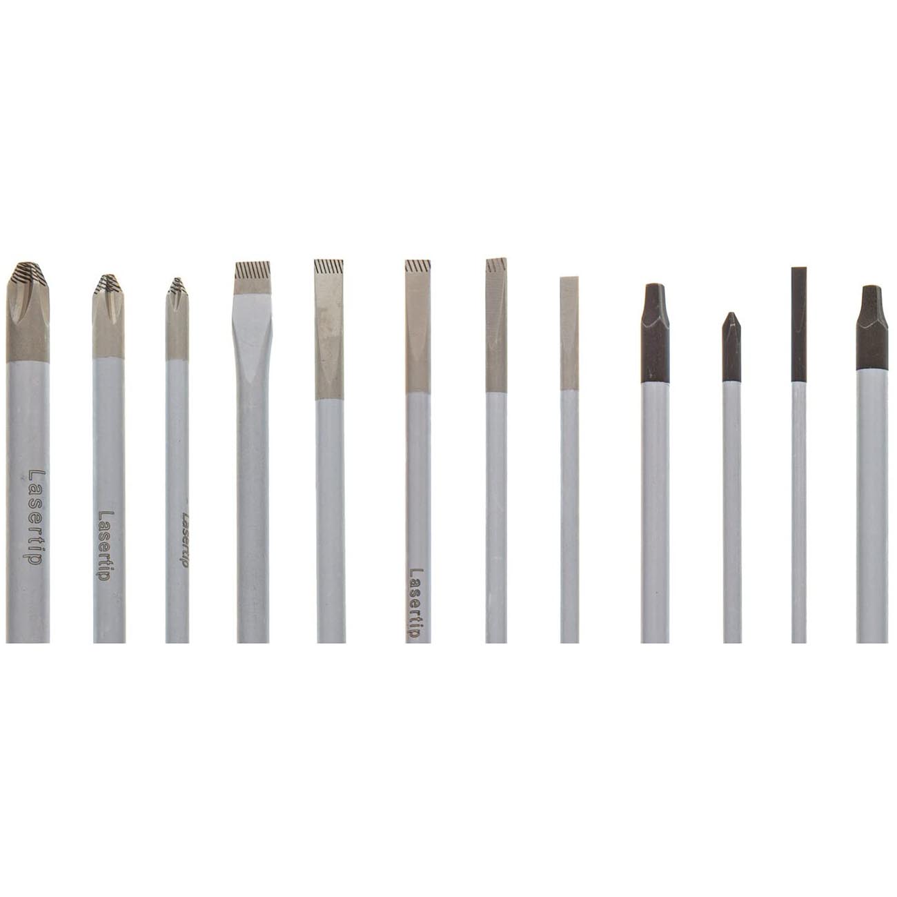 Kraftform multi-component handle, with hard and soft zones, fits the shape to the hand for the ultimate in comfort and high-speed torque transfer Lasertip bites into the screw’s head to ensure a perfect fit and reduced slip out (anti cam out) Anti-roll protection at base of handle stops screwdrivers from rolling away at the workplace Handle markings include screw symbol and size of tip to easily find the right screwdriver.