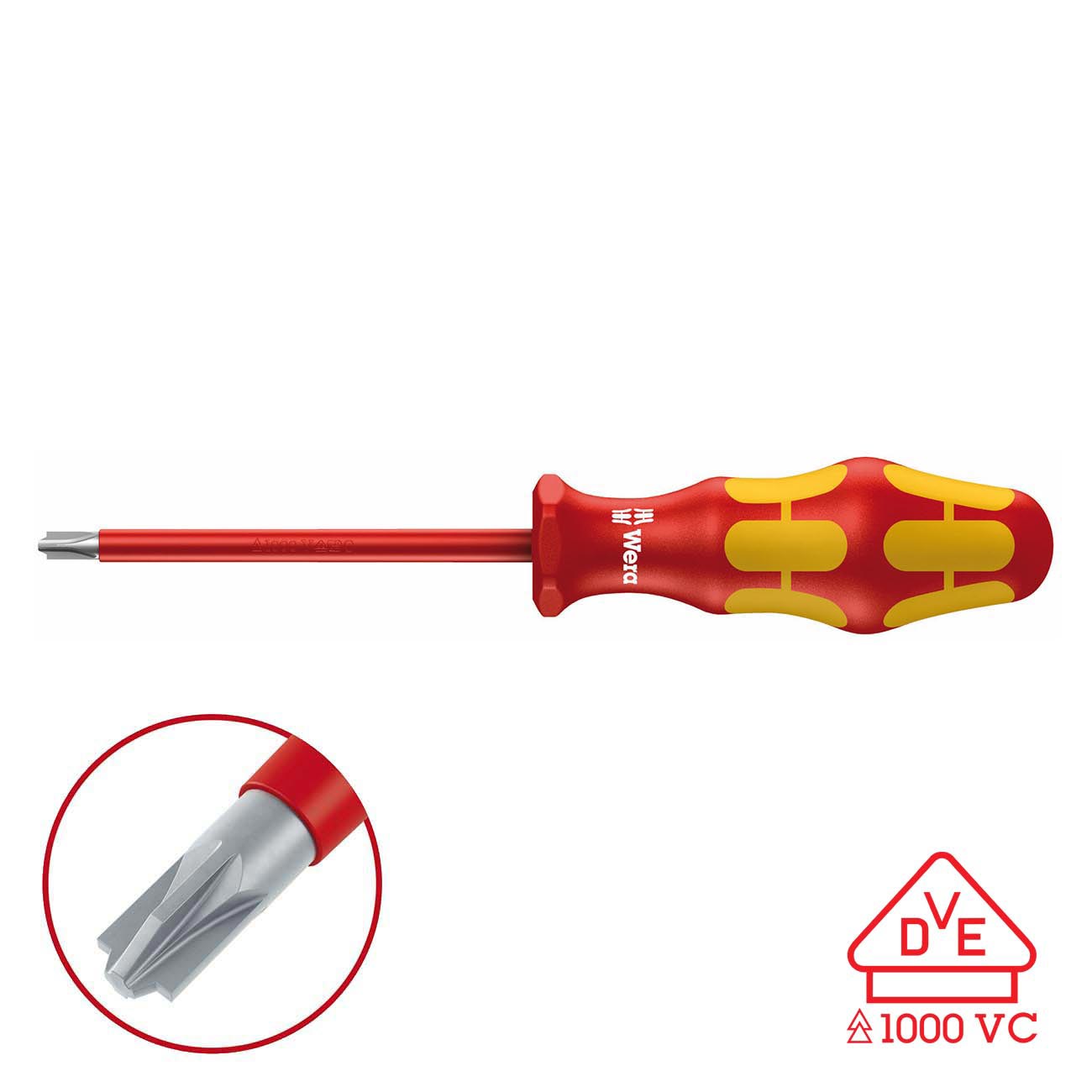 Wera VDE Insulated screwdrivers with multi-component Kraftform Plus handle for fast and low-fatigue working: hard gripping zones for high working speeds whereas soft zones ensure high torque transfer. Combination profile – slotted and Phillips particularly for jobs on terminal blocks, fuse boxes, switches and relays. Individually tested in water bath at 10,000 volts for secure work at the permissible voltage of 1,000 volts. The hexagonal anti-roll feature prevents any bothersome rolling away at the workplace.