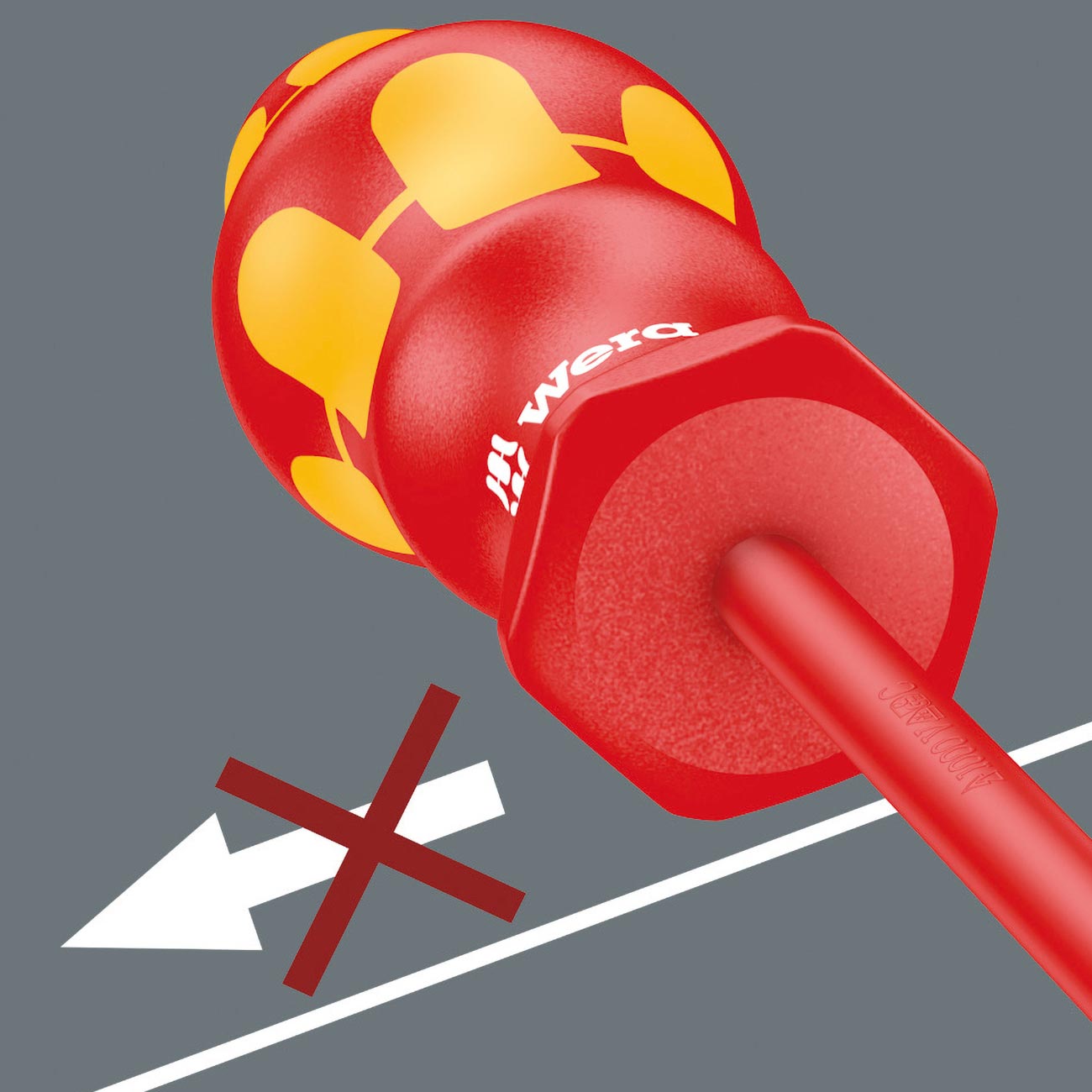 Wera VDE Insulated screwdrivers with multi-component Kraftform handle for fast and low-fatigue working: hard gripping zones for high working speeds whereas soft zones ensure high torque transfer. Individual testing at 10,000 volts so as to ensure safe working at the permitted voltage of 1,000 volts. Any unintentional slipping out is therefore a thing of the past. “Take it easy” tool finder with color coding according to profiles and size stamp – for simple and rapid accessing of the required tool. The hexagonal anti-roll feature prevents any bothersome rolling away at the workplace.