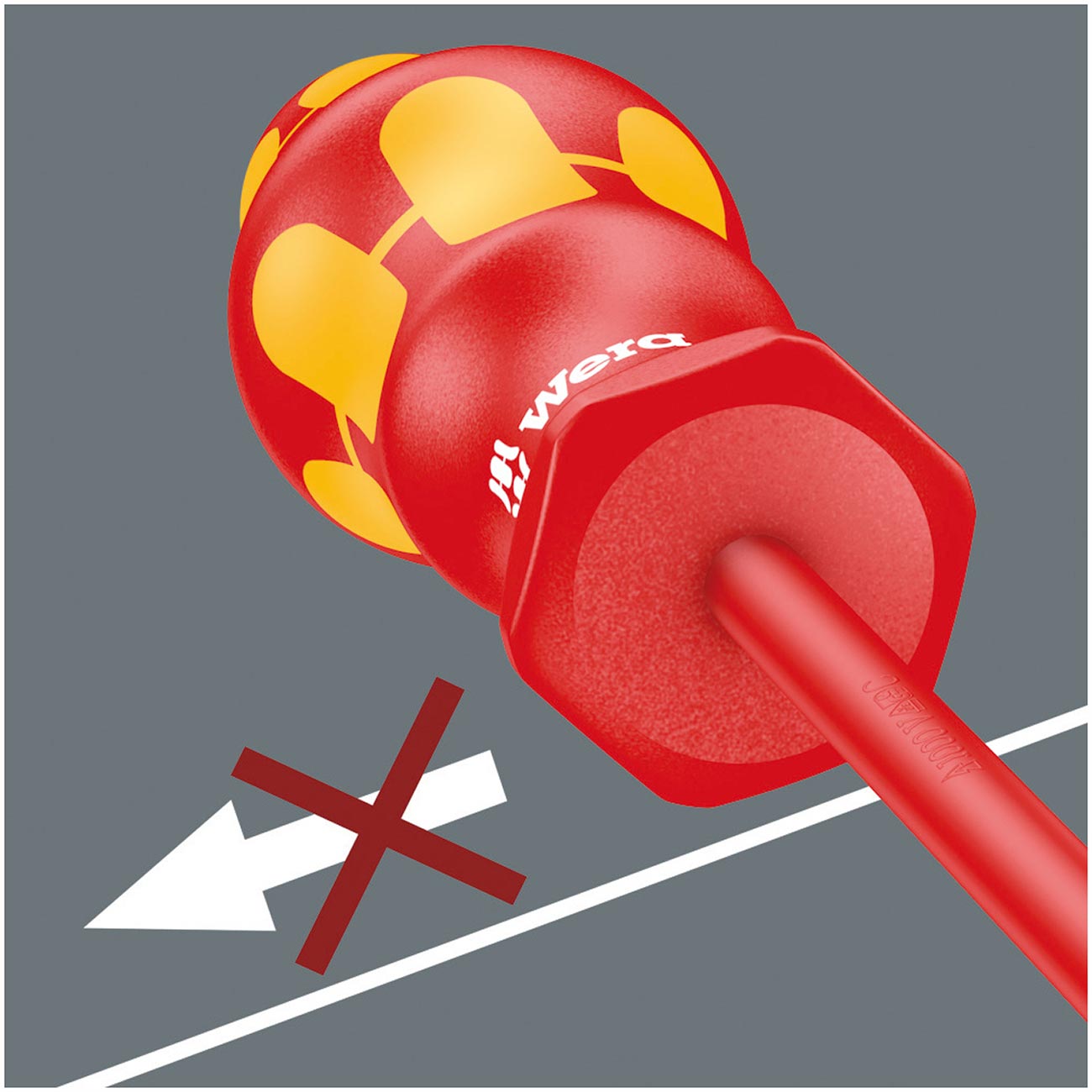 Wera VDE Insulated screwdriver with multi-component Kraftform Plus handle for fast and smooth work: Hard handle zones for high working speeds, while soft handle zones guarantee a high torque transfer. Individually tested at 10,000 V for safe working at the approved voltage of 1,000 V. Take it easy tool finder with color coding by profile and size stamping – for quick and easy identification of the required tool. The hexagon anti-roll protection avoids screwdrivers from rolling away annoyingly at the workplace.