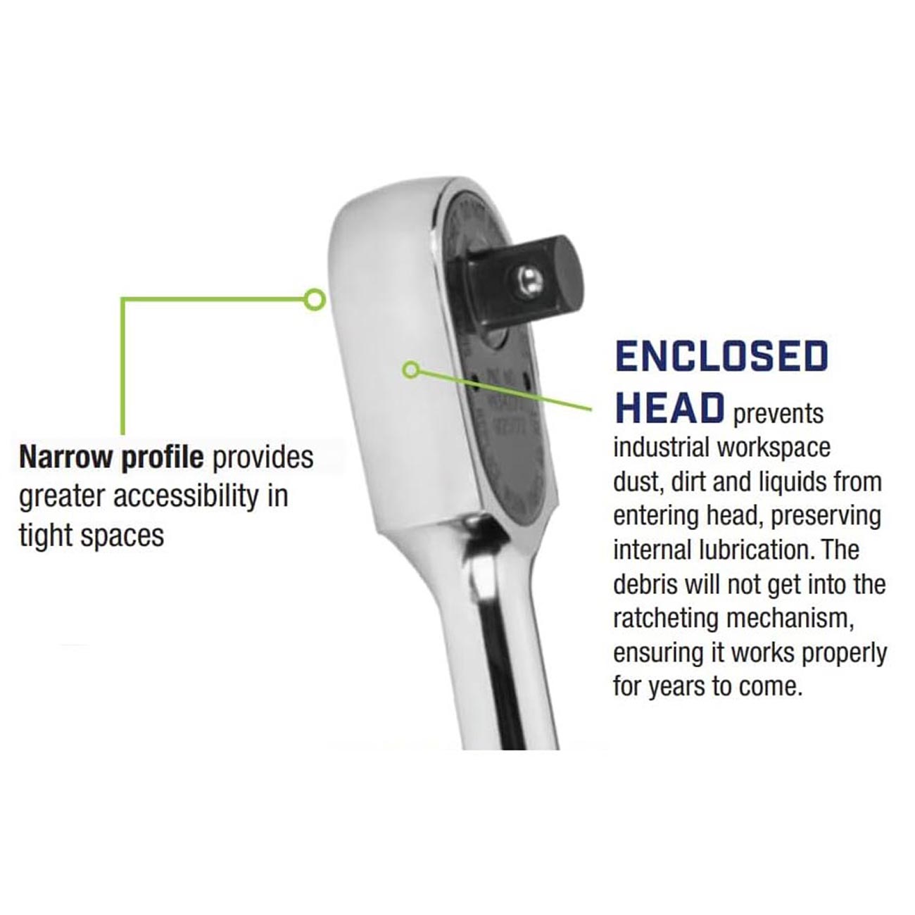 Enclosed head is sealed to prevent dust, dirt, and liquids from entering head, preserving internal lubrication