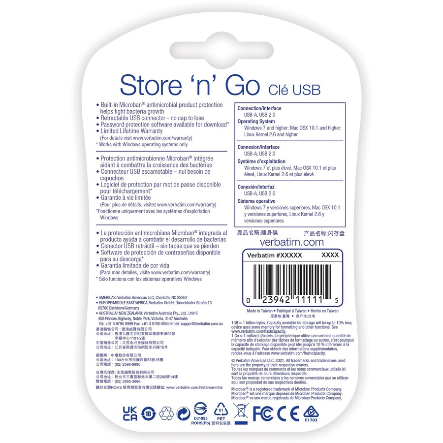 These Verbatim USB drives include built-in Microban® antimicrobial product protection. This antimicrobial technology helps prevent the growth of bacteria – keeping your USB drives cleaner!