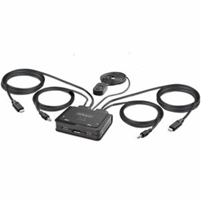 2-Port USB-C KVM Switch enables switching between two USB Type-C DP Alt Mode-enabled laptops to share a keyboard/mouse/audio/4K 60Hz DisplayPort display – Small Form Factor with built-in 4ft/1.2m USB-C/Audio host cables; Bus Powered – Cable KVM Switch works on all hardware platforms including Intel/AMD/Apple M1/M2; OS Independent – Remote Push-Button (5ft/1.5m attached cable) or Hotkey Commands with available software; Independent audio switching for uninterrupted audio