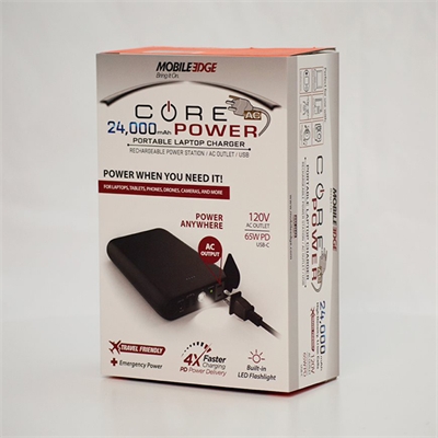 CORE Power 24000mAh AC/USB Laptop Power Charger the 65W USB-C Power Delivery port is every bit as powerful as your standard laptop charger, and the seriously huge 24,000mAh capacity is enough to double your laptop s battery life on the go. Whether you re traveling out of the country, camping off the grid, or just kicking back at a tailgate with 4 outputs and 3 different ways to charge including a built-in AC outlet you can recharge whatever you need, whenever you need it.
