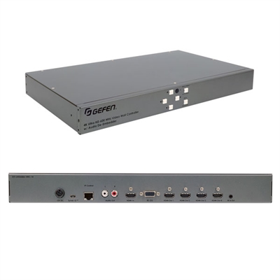 4K Ultra HD 600 MHz 1×4 Video Wall Controller w/ Audio De-Embedder. The Gefen 4K Ultra HD 600 MHz Video Wall Controller is the perfect solution for entertainment and digital signage applications in retail outlets, clubs, trade shows, control centers, building lobbies, and other venues where a large, high quality 4K picture is required. It accepts a single 4K 60 Hz 4:4:4 (18 Gbps, 600 MHz TMDS clock) HDCP 2.2 or 1.4 compliant HDMI source, and using its advanced video processing technology divides the picture pixel by pixel and without any extrapolation or approximation, over four equally-sized 1080p Full HD displays. It can also create multiple display configurations using predefined row or column layouts, up to a maximum of four displays installed in vertical or horizontal orientation, or allow complete customization of how the input is cropped and outputted to each screen.