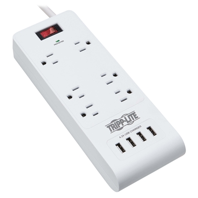 6-Outlet Surge Protector with USB Charging Safeguards Your Sensitive ElectronicsIdeal for your home or office workstation or home theater, this Protect It! 6-outlet surge protector features a surge suppression rating of 900 joules to defend your sensitive electronic components against even the strongest power surges and spikes. Because residential power outlets have three wires hot line (H), neutral (N) and ground (G) the TLP64USBRA15 protects all three, covering the two protection modes: full normal mode (H-N) and common mode (N-G/H-G).NEMA 5-15R Outlets Accept a Wide Range of Electronic DevicesPlug your PC, printer, wireless router, game console, television, sound system or other home/office electronics into six NEMA 5-15R outlets to protect them against dangerous surges, spikes and line noise. Two outlets are set apart from the others to accept bulky transformers without blocking adjacent outlets.4 USB Ports Share 4.2 Amps of Charging PowerFour USB-A ports are available for charging your smartphone, tablet and other USB mobile devices. They share 4.2A for charging multiple devices at the same time.Premium Protection from EMI/RFI Line Noise Helps Your Equipment Perform BetterVarious electromagnetic and radio sources found in virtually every home and business can cause disruptive interference on the AC line. Known as EMI (electromagnetic interference) and RFI (radio frequency interference), this line noise is a common cause of performance problems. This surge protector filters out disruptive line noise that can disturb your electronics and inflict hardware damage or data loss. This EMI/RFI filtering also helps your connected components perform better and last longer.Premium Safety Features Protect Your Valuable EquipmentThe lighted on/off switch provides one-touch control over connected equipment. A 15A circuit breaker protects all outlets and automatically cuts power if the protection circuit is incapacitated, preventing equipment damage. A green LED confirms your connected equipment is protected.Versatile Surge Protector Provides Multiple Installation OptionsThis surge protector with 15-foot cord and space-saving right-angle NEMA 5-15P plug allows you flexibility in placing the unit away from a wall outlet or behind furniture. Keyhole slots incorporated into the bottom panel provide convenient wall or desk mounting options for the black plastic housing.