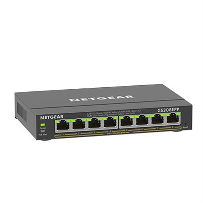 Introducing the NETGEAR GS308EPP PoE+ Gigabit Ethernet Smart Managed Plus Switch with 8 ports PoE+ and a total PoE budget of 124W to power PoE applications such as VoIP phones, IP cameras for surveillance, wireless access points and more. GS308EPP also includes basic and advanced network management features to help optimize the performance of business networks.