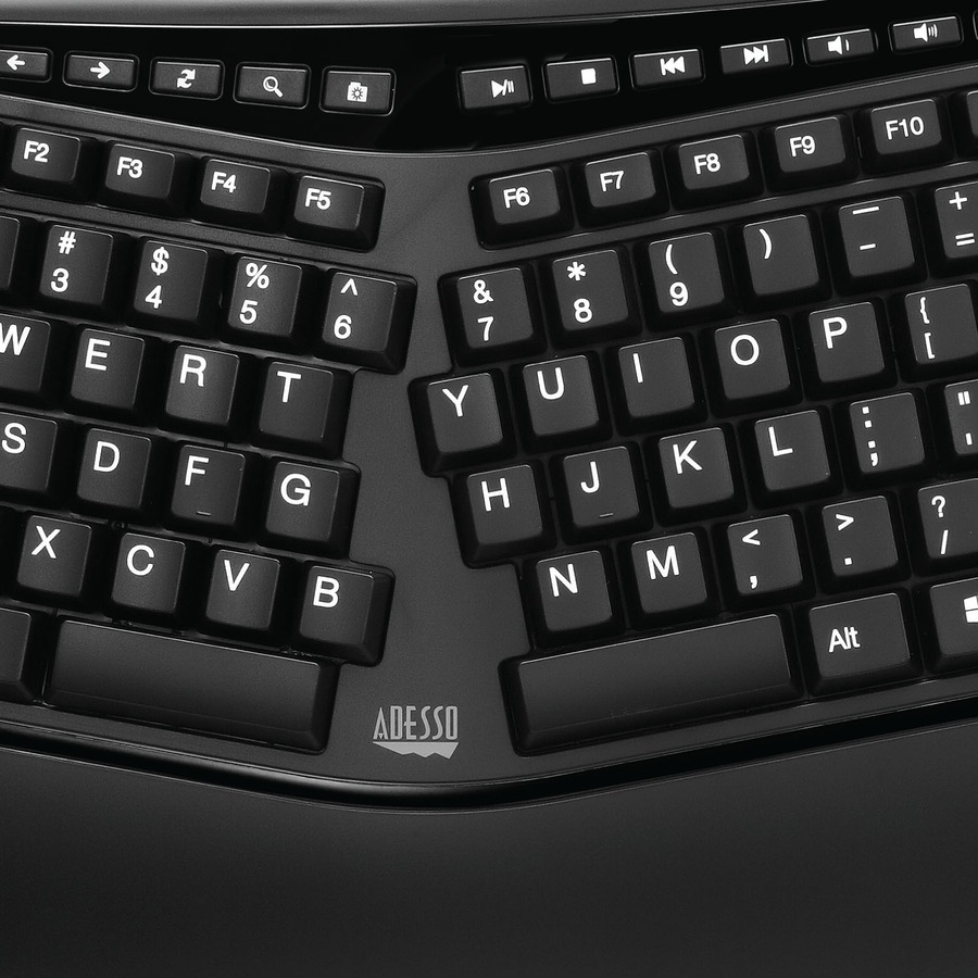 The design of this keyboard with the split key zones and gently sloped shape encourages natural position of hands, wrists, and forearms in maximum comfort for long use.