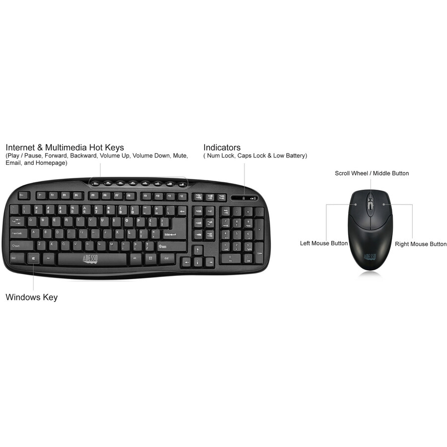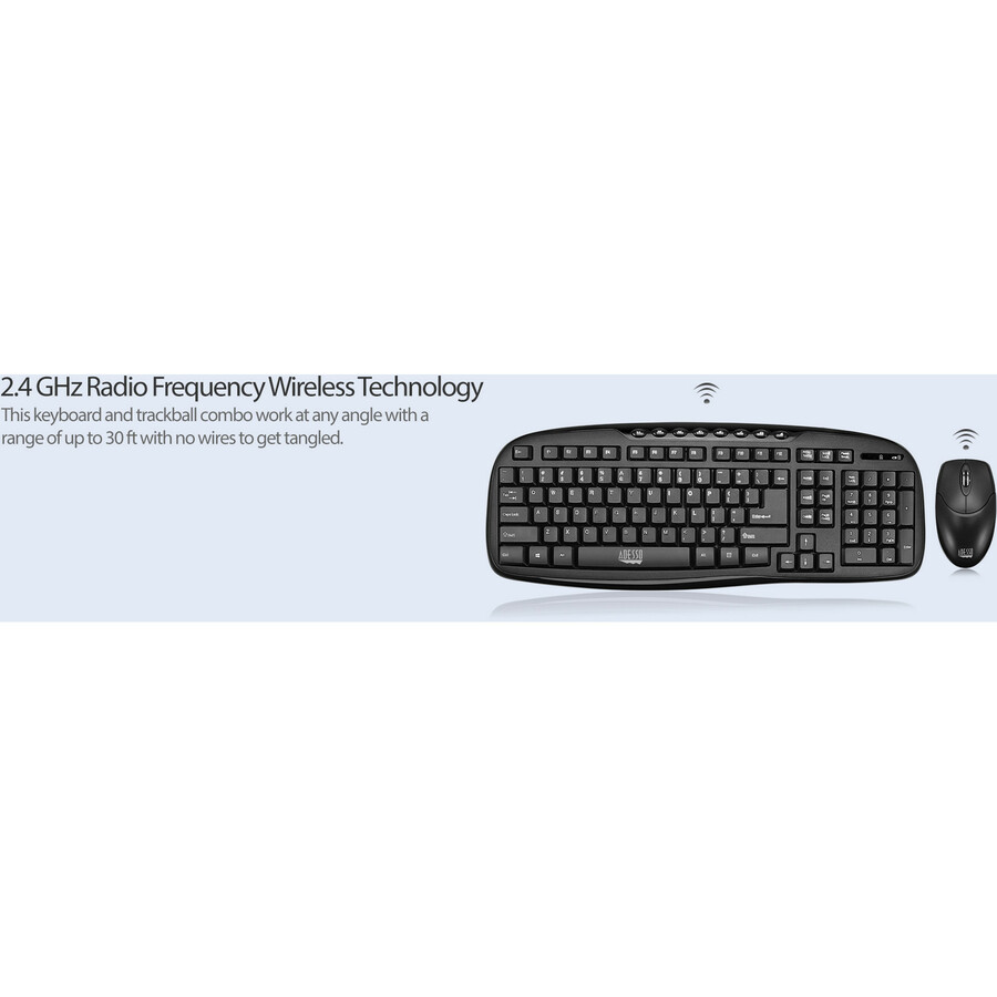 The Adesso® WKB-1330CB Wireless Desktop Multimedia Keyboard and mouse combo is a great choice for users who want a stylish designed keyboard along with a mouse for home and office use. The keyboard’s Hotkeys provide quick access to your media player controls and email. The 3 button mouse is designed with an enhanced optical sensor of 1200 DPI which provides better speed and accuracy. With a 2.4GHz connection, no wires or cords will be tangled and you have a 30 ft range in any direction.