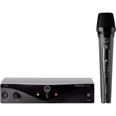 Frequency agile wireless microphone system including SR45 Stationary Receiver, HT45 Handheld Transmitter, SMPS Switched Mode Power Supply (EU/US/UK), Stand Adapter, 1 AA Battery