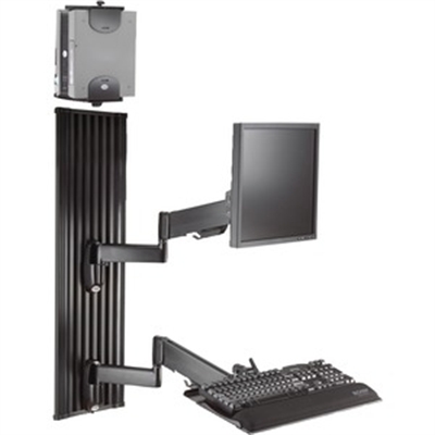 All-in-One Monitor Workstation Wall Mount. Includes a height-adjustable monitor mount, a height-adjustable flip-up keyboard tray and a CPU mount. Provides flexibility and ultimate space savings for multi-user environments