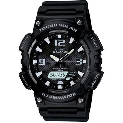 CASIO ANA-DIGI SOLAR WATCH. Black resin band, solar digital analog watch with black & white face. Utilizing a unique Self-Charging solar power system, this sporty analog/digital combination model provides plenty of functionality. A host of features such as 48-city world time, 5 alarms, stopwatch and dual countdown timers make this a versatile timepiece for almost any sport outing. 100M water resistant.