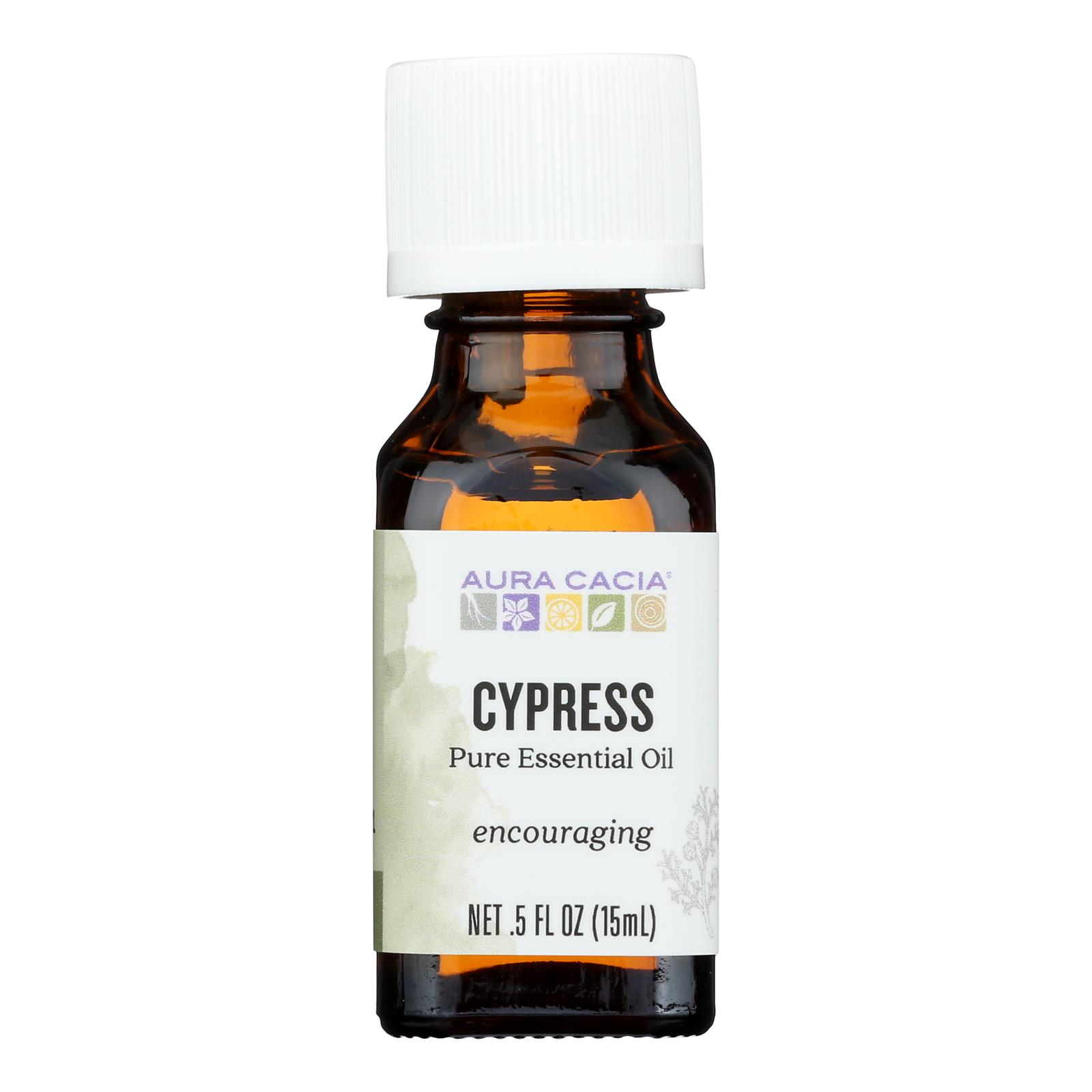 AURA CACIA ESSENTIAL OIL, CYPRESS IS A FOREST-LIKE OIL THAT HAS BENEFICIAL PROPERTIES. THIS OPENING OIL IS PERFECT IN A BODY REFRESHER AND INNER STRENGTH DIFFUSER. THIS 100% PURE ESSENTIAL OIL MUST BE DILUTED PROPERLY SINCE IT MAY IRRITATE THE SKIN. EACH BOTTLE OF AURA CACIA ESSENTIAL OIL, CYPRESS CONTAINS 0.5 FL. OZ. OF PRODUCT. SEE LABEL FOR WARNINGS.